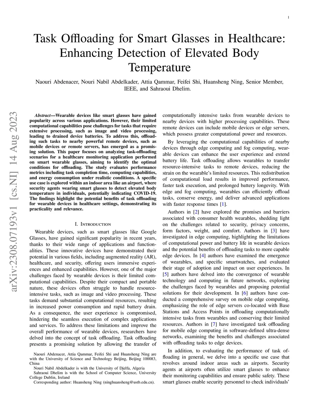 Wearable devices like smart glasses have gained popularity across various applications. However, their limited computational capabilities pose challenges for tasks that require extensive processing, such as image and video processing, leading to drained device batteries. To address this, offloading such tasks to nearby powerful remote devices, such as mobile devices or remote servers, has emerged as a promising solution. This paper focuses on analyzing task-offloading scenarios for a healthcare monitoring application performed on smart wearable glasses, aiming to identify the optimal conditions for offloading. The study evaluates performance metrics including task completion time, computing capabilities, and energy consumption under realistic conditions. A specific use case is explored within an indoor area like an airport, where security agents wearing smart glasses to detect elevated body temperature in individuals, potentially indicating COVID-19. The findings highlight the potential benefits of task offloading for wearable devices in healthcare settings, demonstrating its practicality and relevance.