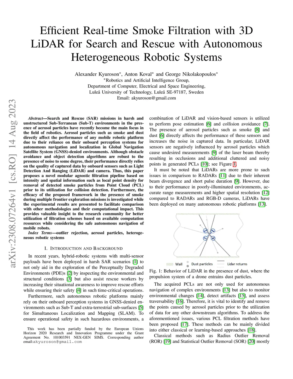 Search and Rescue (SAR) missions in harsh and unstructured Sub-Terranean (Sub-T) environments in the presence of aerosol particles have recently become the main focus in the field of robotics. Aerosol particles such as smoke and dust directly affect the performance of any mobile robotic platform due to their reliance on their onboard perception systems for autonomous navigation and localization in Global Navigation Satellite System (GNSS)-denied environments. Although obstacle avoidance and object detection algorithms are robust to the presence of noise to some degree, their performance directly relies on the quality of captured data by onboard sensors such as Light Detection And Ranging (LiDAR) and camera. Thus, this paper proposes a novel modular agnostic filtration pipeline based on intensity and spatial information such as local point density for removal of detected smoke particles from Point Cloud (PCL) prior to its utilization for collision detection. Furthermore, the efficacy of the proposed framework in the presence of smoke during multiple frontier exploration missions is investigated while the experimental results are presented to facilitate comparison with other methodologies and their computational impact. This provides valuable insight to the research community for better utilization of filtration schemes based on available computation resources while considering the safe autonomous navigation of mobile robots.