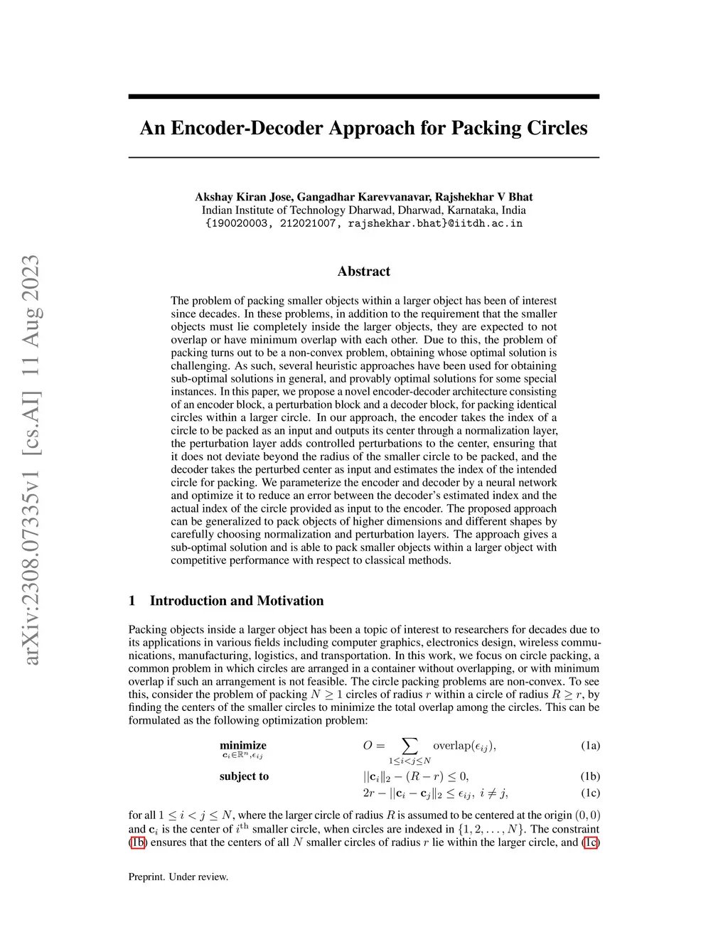 The problem of packing smaller objects within a larger object has been of interest since decades. In these problems, in addition to the requirement that the smaller objects must lie completely inside the larger objects, they are expected to not overlap or have minimum overlap with each other. Due to this, the problem of packing turns out to be a non-convex problem, obtaining whose optimal solution is challenging. As such, several heuristic approaches have been used for obtaining sub-optimal solutions in general, and provably optimal solutions for some special instances. In this paper, we propose a novel encoder-decoder architecture consisting of an encoder block, a perturbation block and a decoder block, for packing identical circles within a larger circle. In our approach, the encoder takes the index of a circle to be packed as an input and outputs its center through a normalization layer, the perturbation layer adds controlled perturbations to the center, ensuring that it does not deviate beyond the radius of the smaller circle to be packed, and the decoder takes the perturbed center as input and estimates the index of the intended circle for packing. We parameterize the encoder and decoder by a neural network and optimize it to reduce an error between the decoder's estimated index and the actual index of the circle provided as input to the encoder. The proposed approach can be generalized to pack objects of higher dimensions and different shapes by carefully choosing normalization and perturbation layers. The approach gives a sub-optimal solution and is able to pack smaller objects within a larger object with competitive performance with respect to classical methods.