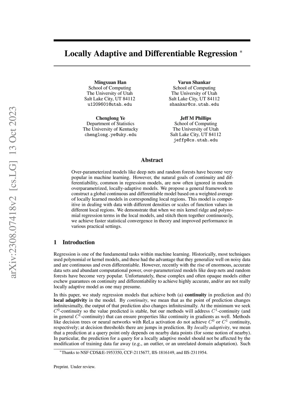 Over-parameterized models like deep nets and random forests have become very popular in machine learning. However, the natural goals of continuity and differentiability, common in regression models, are now often ignored in modern overparametrized, locally-adaptive models. We propose a general framework to construct a global continuous and differentiable model based on a weighted average of locally learned models in corresponding local regions. This model is competitive in dealing with data with different densities or scales of function values in different local regions. We demonstrate that when we mix kernel ridge and polynomial regression terms in the local models, and stitch them together continuously, we achieve faster statistical convergence in theory and improved performance in various practical settings.