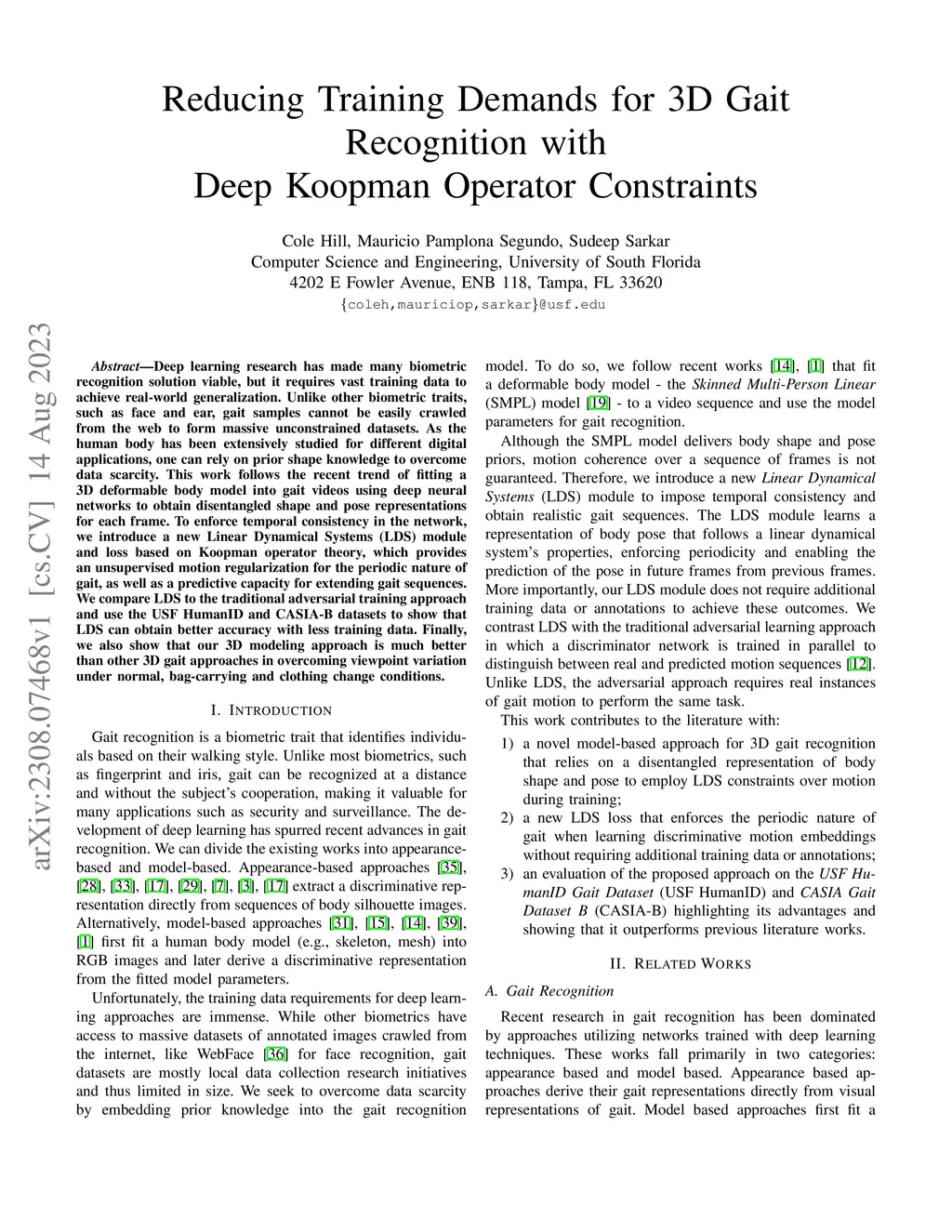 Deep learning research has made many biometric recognition solution viable, but it requires vast training data to achieve real-world generalization. Unlike other biometric traits, such as face and ear, gait samples cannot be easily crawled from the web to form massive unconstrained datasets. As the human body has been extensively studied for different digital applications, one can rely on prior shape knowledge to overcome data scarcity. This work follows the recent trend of fitting a 3D deformable body model into gait videos using deep neural networks to obtain disentangled shape and pose representations for each frame. To enforce temporal consistency in the network, we introduce a new Linear Dynamical Systems (LDS) module and loss based on Koopman operator theory, which provides an unsupervised motion regularization for the periodic nature of gait, as well as a predictive capacity for extending gait sequences. We compare LDS to the traditional adversarial training approach and use the USF HumanID and CASIA-B datasets to show that LDS can obtain better accuracy with less training data. Finally, we also show that our 3D modeling approach is much better than other 3D gait approaches in overcoming viewpoint variation under normal, bag-carrying and clothing change conditions.