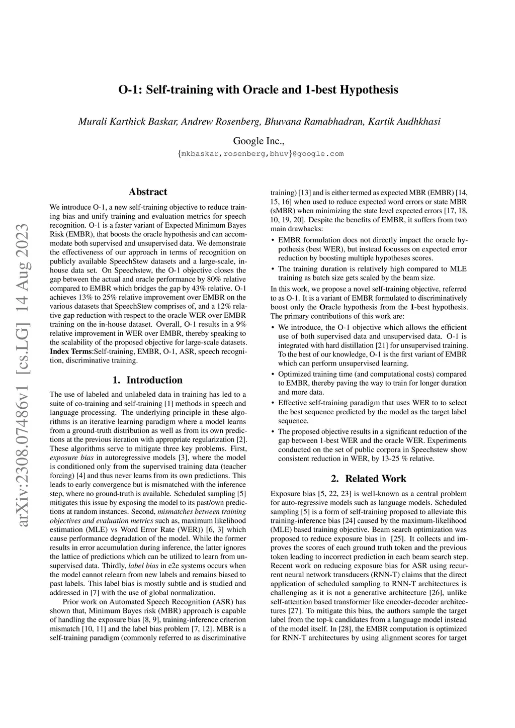 We introduce O-1, a new self-training objective to reduce training bias and unify training and evaluation metrics for speech recognition. O-1 is a faster variant of Expected Minimum Bayes Risk (EMBR), that boosts the oracle hypothesis and can accommodate both supervised and unsupervised data. We demonstrate the effectiveness of our approach in terms of recognition on publicly available SpeechStew datasets and a large-scale, in-house data set. On Speechstew, the O-1 objective closes the gap between the actual and oracle performance by 80\% relative compared to EMBR which bridges the gap by 43\% relative. O-1 achieves 13\% to 25\% relative improvement over EMBR on the various datasets that SpeechStew comprises of, and a 12\% relative gap reduction with respect to the oracle WER over EMBR training on the in-house dataset. Overall, O-1 results in a 9\% relative improvement in WER over EMBR, thereby speaking to the scalability of the proposed objective for large-scale datasets.