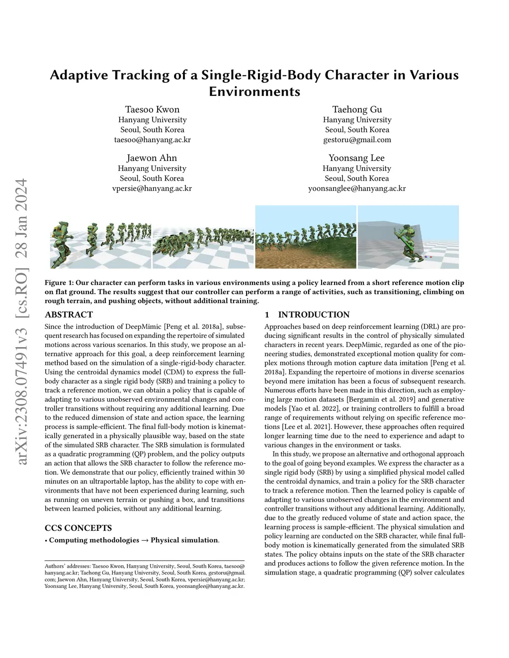 Since the introduction of DeepMimic [Peng et al. 2018], subsequent research has focused on expanding the repertoire of simulated motions across various scenarios. In this study, we propose an alternative approach for this goal, a deep reinforcement learning method based on the simulation of a single-rigid-body character. Using the centroidal dynamics model (CDM) to express the full-body character as a single rigid body (SRB) and training a policy to track a reference motion, we can obtain a policy that is capable of adapting to various unobserved environmental changes and controller transitions without requiring any additional learning. Due to the reduced dimension of state and action space, the learning process is sample-efficient. The final full-body motion is kinematically generated in a physically plausible way, based on the state of the simulated SRB character. The SRB simulation is formulated as a quadratic programming (QP) problem, and the policy outputs an action that allows the SRB character to follow the reference motion. We demonstrate that our policy, efficiently trained within 30 minutes on an ultraportable laptop, has the ability to cope with environments that have not been experienced during learning, such as running on uneven terrain or pushing a box, and transitions between learned policies, without any additional learning.