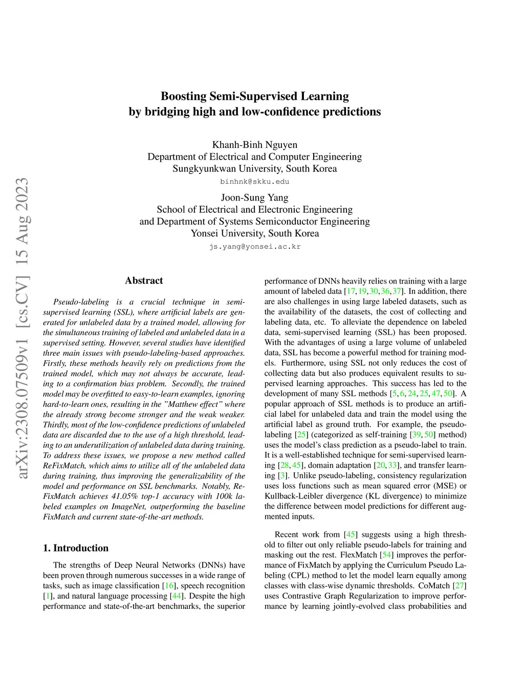 Pseudo-labeling is a crucial technique in semi-supervised learning (SSL), where artificial labels are generated for unlabeled data by a trained model, allowing for the simultaneous training of labeled and unlabeled data in a supervised setting. However, several studies have identified three main issues with pseudo-labeling-based approaches. Firstly, these methods heavily rely on predictions from the trained model, which may not always be accurate, leading to a confirmation bias problem. Secondly, the trained model may be overfitted to easy-to-learn examples, ignoring hard-to-learn ones, resulting in the \textit{"Matthew effect"} where the already strong become stronger and the weak weaker. Thirdly, most of the low-confidence predictions of unlabeled data are discarded due to the use of a high threshold, leading to an underutilization of unlabeled data during training. To address these issues, we propose a new method called ReFixMatch, which aims to utilize all of the unlabeled data during training, thus improving the generalizability of the model and performance on SSL benchmarks. Notably, ReFixMatch achieves 41.05\% top-1 accuracy with 100k labeled examples on ImageNet, outperforming the baseline FixMatch and current state-of-the-art methods.
