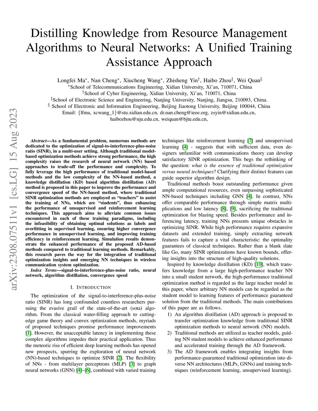 As a fundamental problem, numerous methods are dedicated to the optimization of signal-to-interference-plus-noise ratio (SINR), in a multi-user setting. Although traditional model-based optimization methods achieve strong performance, the high complexity raises the research of neural network (NN) based approaches to trade-off the performance and complexity. To fully leverage the high performance of traditional model-based methods and the low complexity of the NN-based method, a knowledge distillation (KD) based algorithm distillation (AD) method is proposed in this paper to improve the performance and convergence speed of the NN-based method, where traditional SINR optimization methods are employed as ``teachers" to assist the training of NNs, which are ``students", thus enhancing the performance of unsupervised and reinforcement learning techniques. This approach aims to alleviate common issues encountered in each of these training paradigms, including the infeasibility of obtaining optimal solutions as labels and overfitting in supervised learning, ensuring higher convergence performance in unsupervised learning, and improving training efficiency in reinforcement learning. Simulation results demonstrate the enhanced performance of the proposed AD-based methods compared to traditional learning methods. Remarkably, this research paves the way for the integration of traditional optimization insights and emerging NN techniques in wireless communication system optimization.