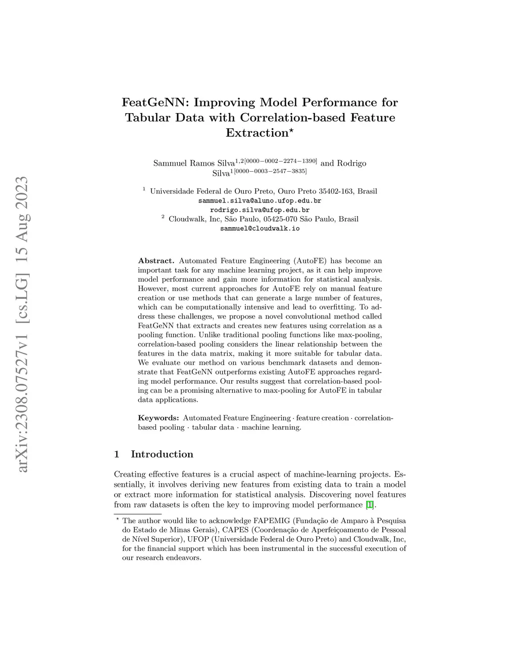 Automated Feature Engineering (AutoFE) has become an important task for any machine learning project, as it can help improve model performance and gain more information for statistical analysis. However, most current approaches for AutoFE rely on manual feature creation or use methods that can generate a large number of features, which can be computationally intensive and lead to overfitting. To address these challenges, we propose a novel convolutional method called FeatGeNN that extracts and creates new features using correlation as a pooling function. Unlike traditional pooling functions like max-pooling, correlation-based pooling considers the linear relationship between the features in the data matrix, making it more suitable for tabular data. We evaluate our method on various benchmark datasets and demonstrate that FeatGeNN outperforms existing AutoFE approaches regarding model performance. Our results suggest that correlation-based pooling can be a promising alternative to max-pooling for AutoFE in tabular data applications.