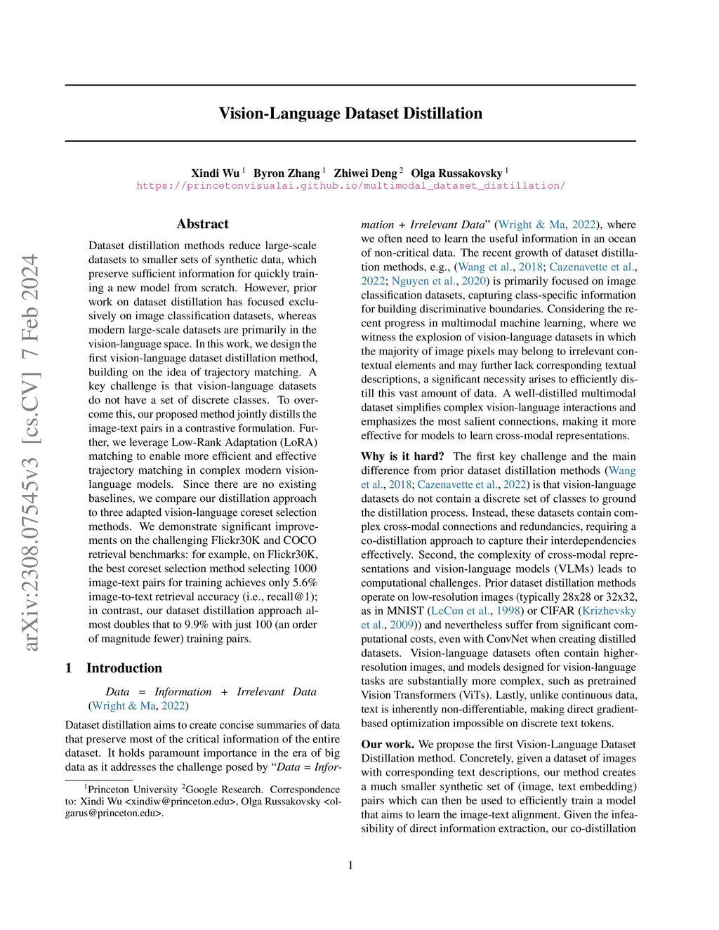 Dataset distillation methods reduce large-scale datasets to smaller sets of synthetic data, which preserve sufficient information for quickly training a new model from scratch. However, prior work on dataset distillation has focused exclusively on image classification datasets, whereas modern large-scale datasets are primarily in the vision-language space. In this work, we design the first vision-language dataset distillation method, building on the idea of trajectory matching. A key challenge is that vision-language datasets do not have a set of discrete classes. To overcome this, our proposed method jointly distills the image-text pairs in a contrastive formulation. Further, we leverage Low-Rank Adaptation (LoRA) matching to enable more efficient and effective trajectory matching in complex modern vision-language models. Since there are no existing baselines, we compare our distillation approach to three adapted vision-language coreset selection methods. We demonstrate significant improvements on the challenging Flickr30K and COCO retrieval benchmarks: for example, on Flickr30K, the best coreset selection method selecting 1000 image-text pairs for training achieves only 5.6% image-to-text retrieval accuracy (i.e., recall@1); in contrast, our dataset distillation approach almost doubles that to 9.9% with just 100 (an order of magnitude fewer) training pairs.