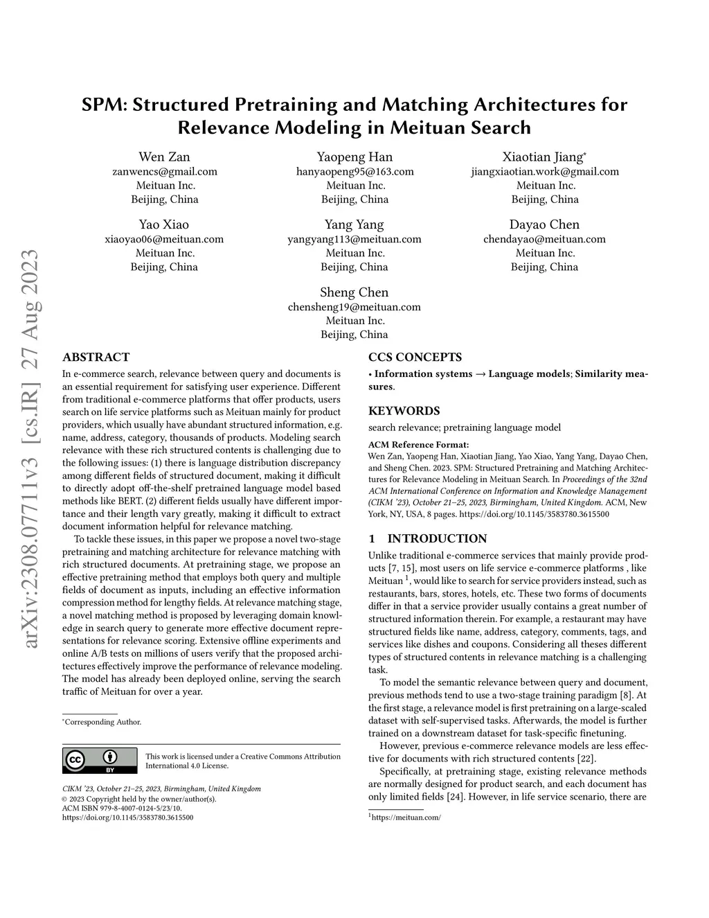 In e-commerce search, relevance between query and documents is an essential requirement for satisfying user experience. Different from traditional e-commerce platforms that offer products, users search on life service platforms such as Meituan mainly for product providers, which usually have abundant structured information, e.g. name, address, category, thousands of products. Modeling search relevance with these rich structured contents is challenging due to the following issues: (1) there is language distribution discrepancy among different fields of structured document, making it difficult to directly adopt off-the-shelf pretrained language model based methods like BERT. (2) different fields usually have different importance and their length vary greatly, making it difficult to extract document information helpful for relevance matching. To tackle these issues, in this paper we propose a novel two-stage pretraining and matching architecture for relevance matching with rich structured documents. At pretraining stage, we propose an effective pretraining method that employs both query and multiple fields of document as inputs, including an effective information compression method for lengthy fields. At relevance matching stage, a novel matching method is proposed by leveraging domain knowledge in search query to generate more effective document representations for relevance scoring. Extensive offline experiments and online A/B tests on millions of users verify that the proposed architectures effectively improve the performance of relevance modeling. The model has already been deployed online, serving the search traffic of Meituan for over a year.