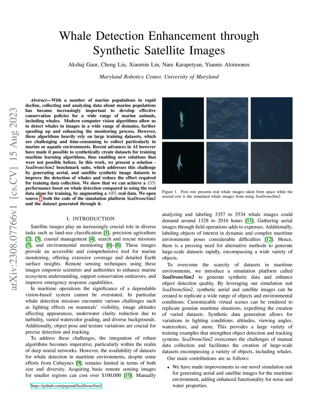 With a number of marine populations in rapid decline, collecting and analyzing data about marine populations has become increasingly important to develop effective conservation policies for a wide range of marine animals, including whales. Modern computer vision algorithms allow us to detect whales in images in a wide range of domains, further speeding up and enhancing the monitoring process. However, these algorithms heavily rely on large training datasets, which are challenging and time-consuming to collect particularly in marine or aquatic environments. Recent advances in AI however have made it possible to synthetically create datasets for training machine learning algorithms, thus enabling new solutions that were not possible before. In this work, we present a solution - SeaDroneSim2 benchmark suite, which addresses this challenge by generating aerial, and satellite synthetic image datasets to improve the detection of whales and reduce the effort required for training data collection. We show that we can achieve a 15% performance boost on whale detection compared to using the real data alone for training, by augmenting a 10% real data. We open source both the code of the simulation platform SeaDroneSim2 and the dataset generated through it.