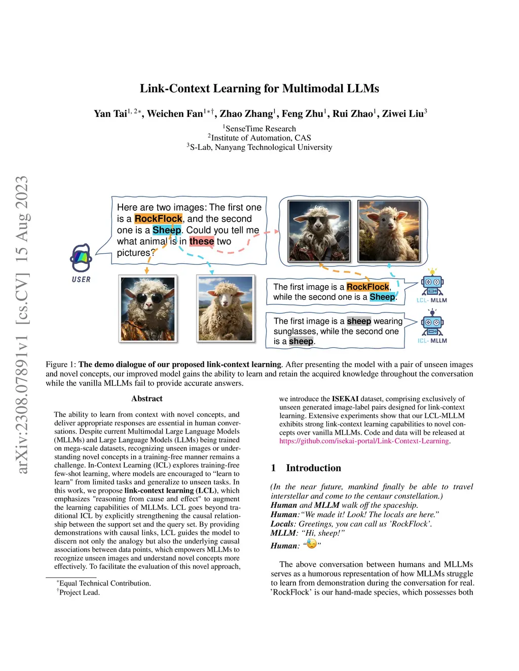 The ability to learn from context with novel concepts, and deliver appropriate responses are essential in human conversations. Despite current Multimodal Large Language Models (MLLMs) and Large Language Models (LLMs) being trained on mega-scale datasets, recognizing unseen images or understanding novel concepts in a training-free manner remains a challenge. In-Context Learning (ICL) explores training-free few-shot learning, where models are encouraged to ``learn to learn" from limited tasks and generalize to unseen tasks. In this work, we propose link-context learning (LCL), which emphasizes "reasoning from cause and effect" to augment the learning capabilities of MLLMs. LCL goes beyond traditional ICL by explicitly strengthening the causal relationship between the support set and the query set. By providing demonstrations with causal links, LCL guides the model to discern not only the analogy but also the underlying causal associations between data points, which empowers MLLMs to recognize unseen images and understand novel concepts more effectively. To facilitate the evaluation of this novel approach, we introduce the ISEKAI dataset, comprising exclusively of unseen generated image-label pairs designed for link-context learning. Extensive experiments show that our LCL-MLLM exhibits strong link-context learning capabilities to novel concepts over vanilla MLLMs. Code and data will be released at https://github.com/isekai-portal/Link-Context-Learning.