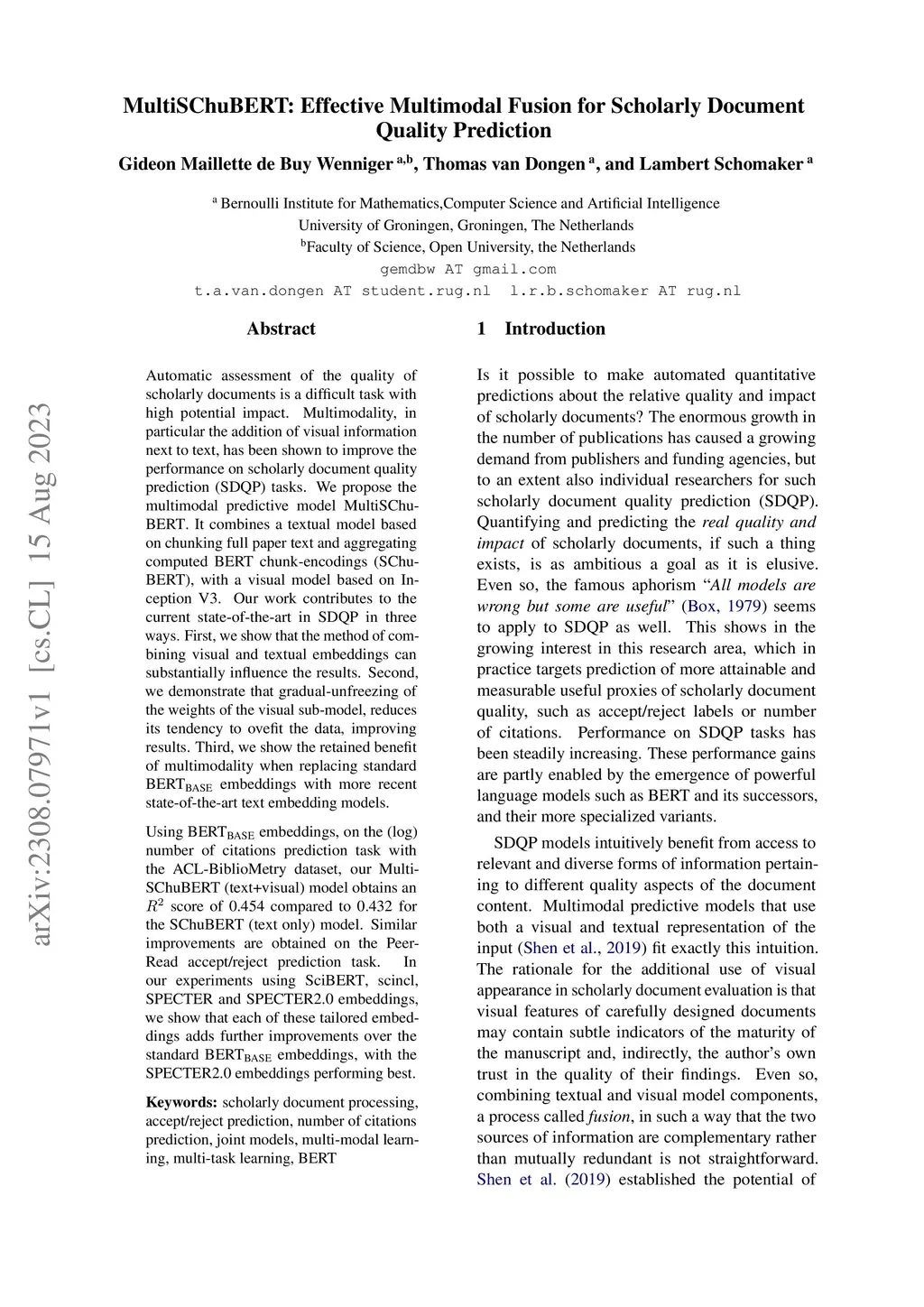 Automatic assessment of the quality of scholarly documents is a difficult task with high potential impact. Multimodality, in particular the addition of visual information next to text, has been shown to improve the performance on scholarly document quality prediction (SDQP) tasks. We propose the multimodal predictive model MultiSChuBERT. It combines a textual model based on chunking full paper text and aggregating computed BERT chunk-encodings (SChuBERT), with a visual model based on Inception V3.Our work contributes to the current state-of-the-art in SDQP in three ways. First, we show that the method of combining visual and textual embeddings can substantially influence the results. Second, we demonstrate that gradual-unfreezing of the weights of the visual sub-model, reduces its tendency to ovefit the data, improving results. Third, we show the retained benefit of multimodality when replacing standard BERT embeddings with more recent state-of-the-art text embedding models. Using BERT embeddings, on the (log) number of citations prediction task with the ACL-BiblioMetry dataset, our MultiSChuBERT (text+visual) model obtains an score of 0.454 compared to 0.432 for the SChuBERT (text only) model. Similar improvements are obtained on the PeerRead accept/reject prediction task. In our experiments using SciBERT, scincl, SPECTER and SPECTER2.0 embeddings, we show that each of these tailored embeddings adds further improvements over the standard BERT embeddings, with the SPECTER2.0 embeddings performing best.