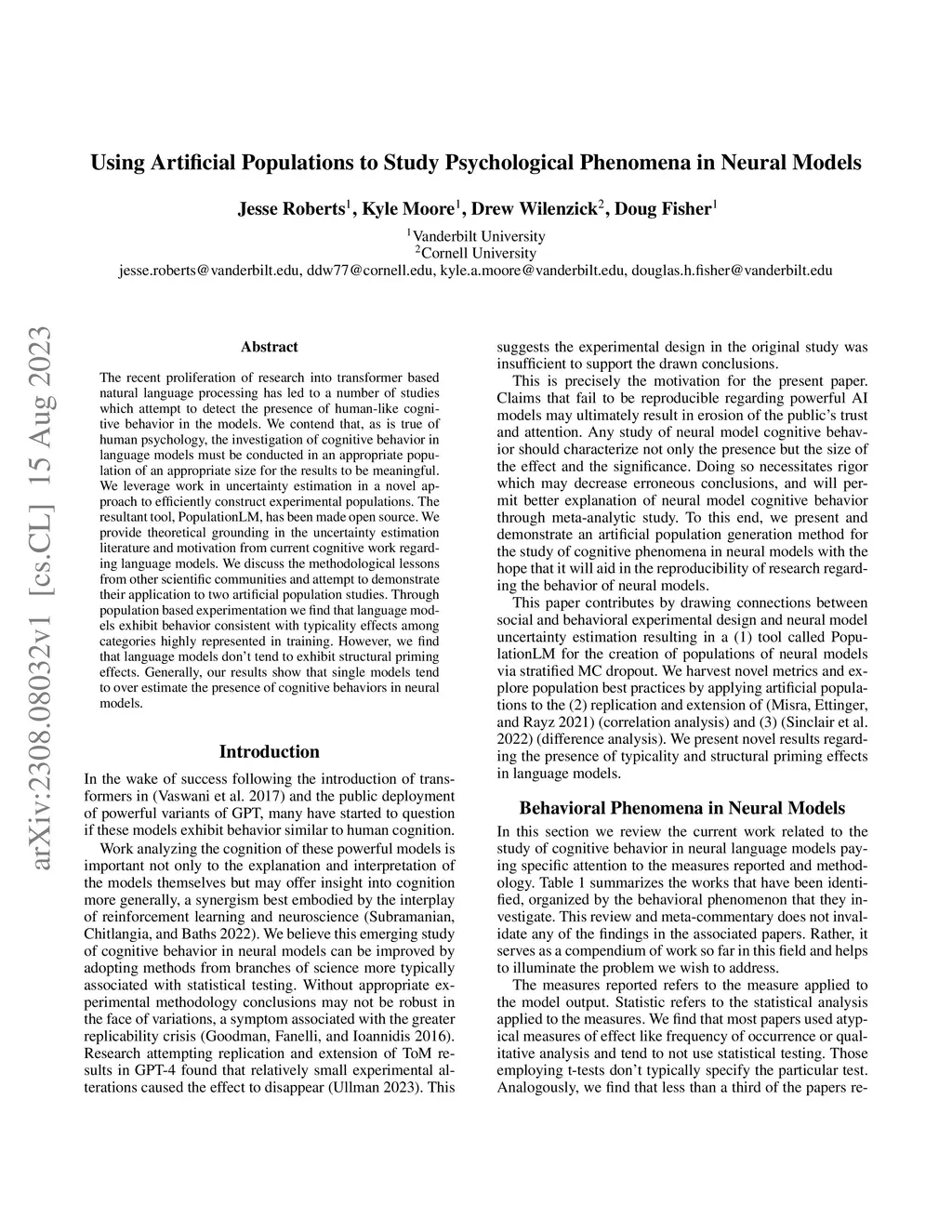 The recent proliferation of research into transformer based natural language processing has led to a number of studies which attempt to detect the presence of human-like cognitive behavior in the models. We contend that, as is true of human psychology, the investigation of cognitive behavior in language models must be conducted in an appropriate population of an appropriate size for the results to be meaningful. We leverage work in uncertainty estimation in a novel approach to efficiently construct experimental populations. The resultant tool, PopulationLM, has been made open source. We provide theoretical grounding in the uncertainty estimation literature and motivation from current cognitive work regarding language models. We discuss the methodological lessons from other scientific communities and attempt to demonstrate their application to two artificial population studies. Through population based experimentation we find that language models exhibit behavior consistent with typicality effects among categories highly represented in training. However, we find that language models don't tend to exhibit structural priming effects. Generally, our results show that single models tend to over estimate the presence of cognitive behaviors in neural models.