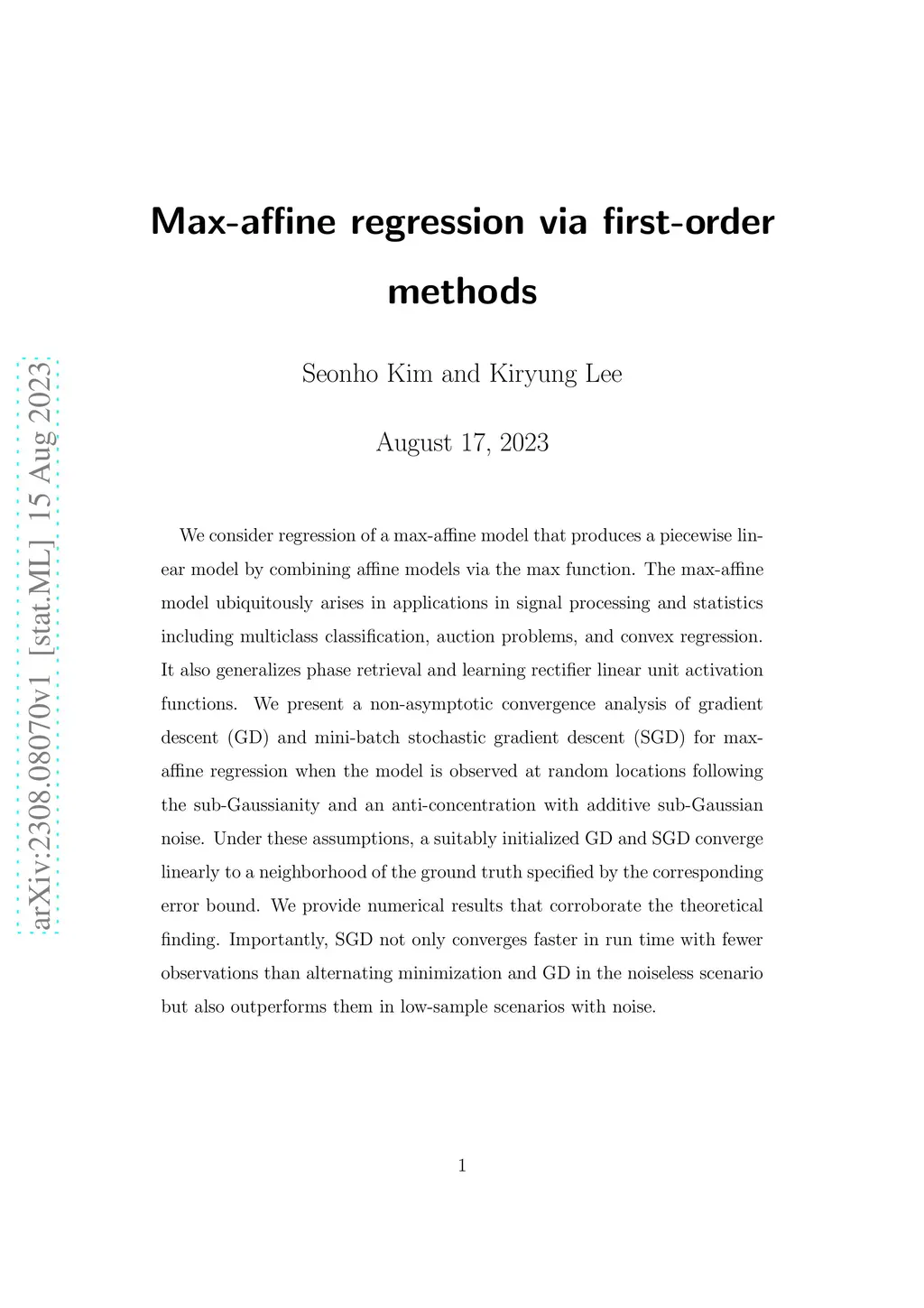 We consider regression of a max-affine model that produces a piecewise linear model by combining affine models via the max function. The max-affine model ubiquitously arises in applications in signal processing and statistics including multiclass classification, auction problems, and convex regression. It also generalizes phase retrieval and learning rectifier linear unit activation functions. We present a non-asymptotic convergence analysis of gradient descent (GD) and mini-batch stochastic gradient descent (SGD) for max-affine regression when the model is observed at random locations following the sub-Gaussianity and an anti-concentration with additive sub-Gaussian noise. Under these assumptions, a suitably initialized GD and SGD converge linearly to a neighborhood of the ground truth specified by the corresponding error bound. We provide numerical results that corroborate the theoretical finding. Importantly, SGD not only converges faster in run time with fewer observations than alternating minimization and GD in the noiseless scenario but also outperforms them in low-sample scenarios with noise.