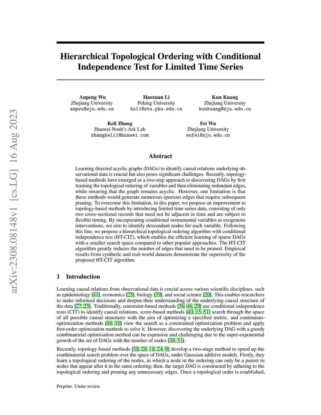 Hierarchical Topological Ordering with Conditional Independence Test for