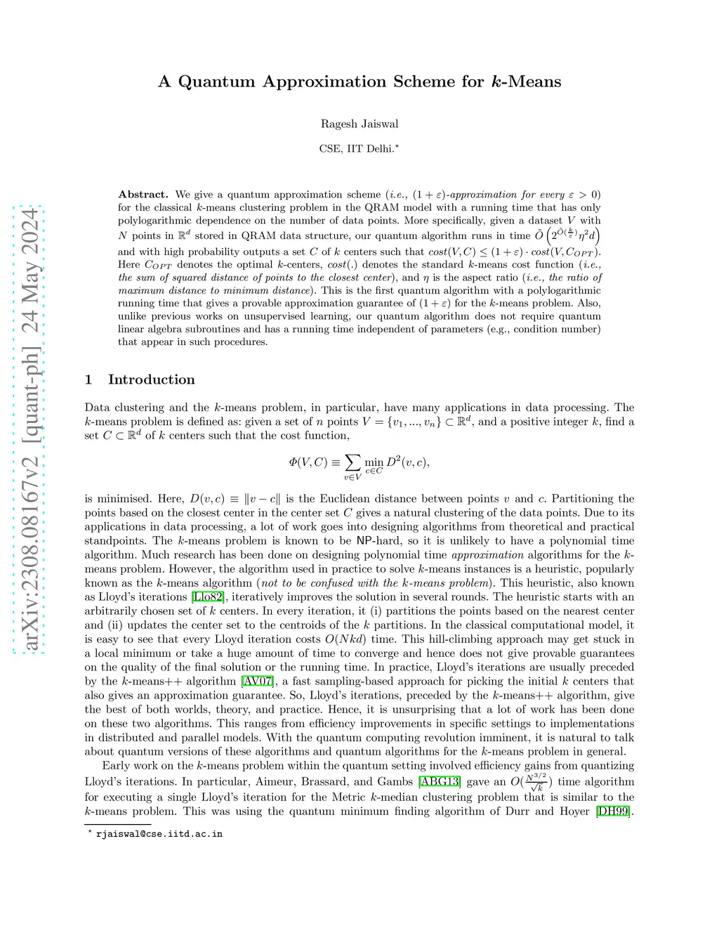 We give a quantum approximation scheme (i.e., -approximation for every ) for the classical -means clustering problem in the QRAM model with a running time that has only polylogarithmic dependence on the number of data points. More specifically, given a dataset with points in stored in QRAM data structure, our quantum algorithm runs in time and with high probability outputs a set of centers such that . Here denotes the optimal -centers, denotes the standard -means cost function (i.e., the sum of the squared distance of points to the closest center), and is the aspect ratio (i.e., the ratio of maximum distance to minimum distance). This is the first quantum algorithm with a polylogarithmic running time that gives a provable approximation guarantee of for the -means problem. Also, unlike previous works on unsupervised learning, our quantum algorithm does not require quantum linear algebra subroutines and has a running time independent of parameters (e.g., condition number) that appear in such procedures.