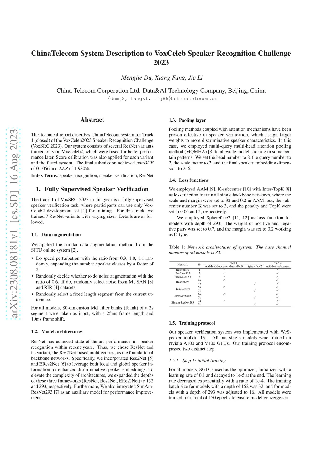 This technical report describes ChinaTelecom system for Track 1 (closed) of the VoxCeleb2023 Speaker Recognition Challenge (VoxSRC 2023). Our system consists of several ResNet variants trained only on VoxCeleb2, which were fused for better performance later. Score calibration was also applied for each variant and the fused system. The final submission achieved minDCF of 0.1066 and EER of 1.980%.