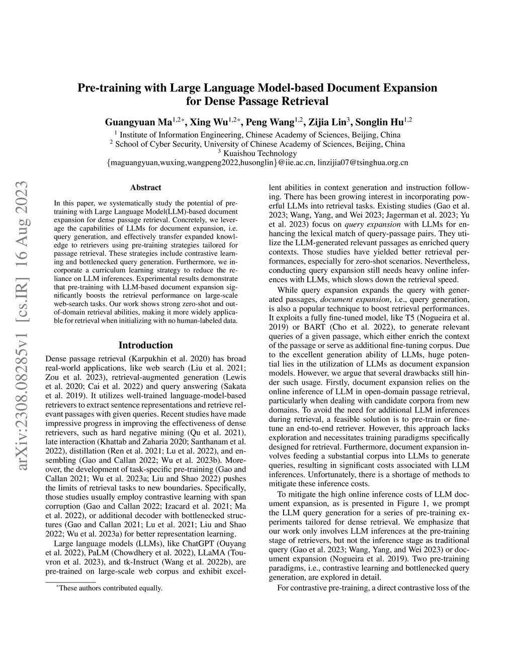 In this paper, we systematically study the potential of pre-training with Large Language Model(LLM)-based document expansion for dense passage retrieval. Concretely, we leverage the capabilities of LLMs for document expansion, i.e. query generation, and effectively transfer expanded knowledge to retrievers using pre-training strategies tailored for passage retrieval. These strategies include contrastive learning and bottlenecked query generation. Furthermore, we incorporate a curriculum learning strategy to reduce the reliance on LLM inferences. Experimental results demonstrate that pre-training with LLM-based document expansion significantly boosts the retrieval performance on large-scale web-search tasks. Our work shows strong zero-shot and out-of-domain retrieval abilities, making it more widely applicable for retrieval when initializing with no human-labeled data.