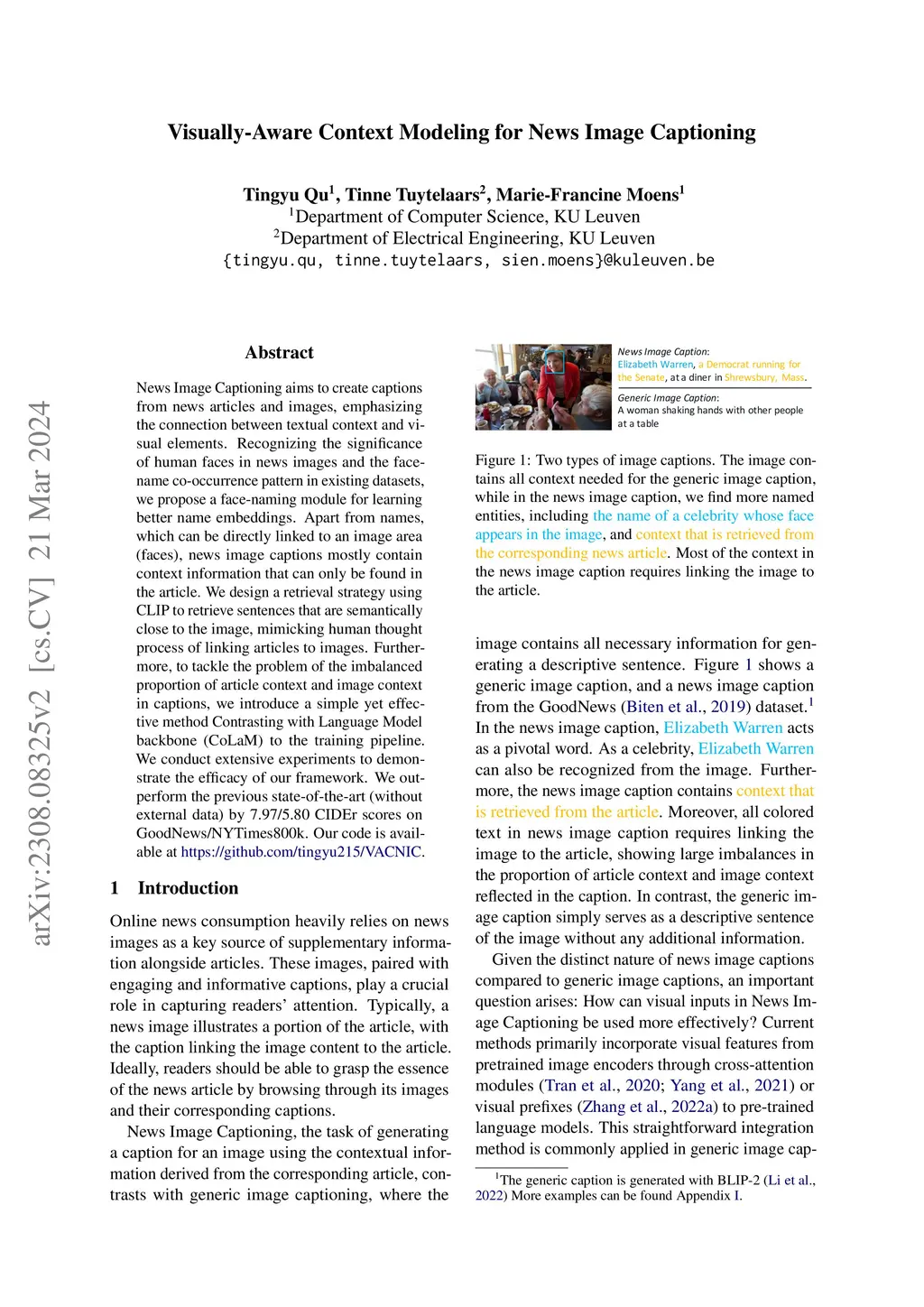 News Image Captioning aims to create captions from news articles and images, emphasizing the connection between textual context and visual elements. Recognizing the significance of human faces in news images and the face-name co-occurrence pattern in existing datasets, we propose a face-naming module for learning better name embeddings. Apart from names, which can be directly linked to an image area (faces), news image captions mostly contain context information that can only be found in the article. We design a retrieval strategy using CLIP to retrieve sentences that are semantically close to the image, mimicking human thought process of linking articles to images. Furthermore, to tackle the problem of the imbalanced proportion of article context and image context in captions, we introduce a simple yet effective method Contrasting with Language Model backbone (CoLaM) to the training pipeline. We conduct extensive experiments to demonstrate the efficacy of our framework. We out-perform the previous state-of-the-art (without external data) by 7.97/5.80 CIDEr scores on GoodNews/NYTimes800k. Our code is available at https://github.com/tingyu215/VACNIC.