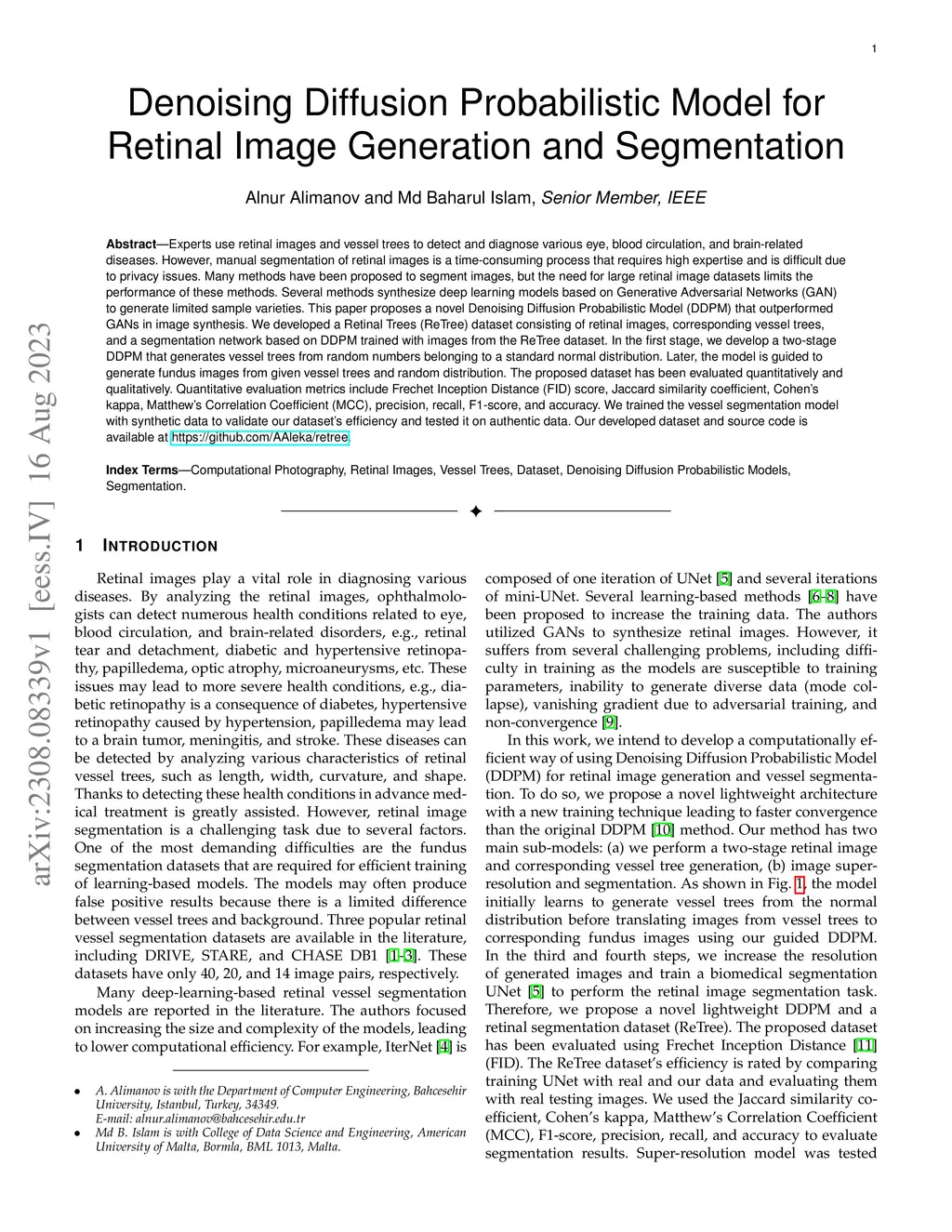Experts use retinal images and vessel trees to detect and diagnose various eye, blood circulation, and brain-related diseases. However, manual segmentation of retinal images is a time-consuming process that requires high expertise and is difficult due to privacy issues. Many methods have been proposed to segment images, but the need for large retinal image datasets limits the performance of these methods. Several methods synthesize deep learning models based on Generative Adversarial Networks (GAN) to generate limited sample varieties. This paper proposes a novel Denoising Diffusion Probabilistic Model (DDPM) that outperformed GANs in image synthesis. We developed a Retinal Trees (ReTree) dataset consisting of retinal images, corresponding vessel trees, and a segmentation network based on DDPM trained with images from the ReTree dataset. In the first stage, we develop a two-stage DDPM that generates vessel trees from random numbers belonging to a standard normal distribution. Later, the model is guided to generate fundus images from given vessel trees and random distribution. The proposed dataset has been evaluated quantitatively and qualitatively. Quantitative evaluation metrics include Frechet Inception Distance (FID) score, Jaccard similarity coefficient, Cohen's kappa, Matthew's Correlation Coefficient (MCC), precision, recall, F1-score, and accuracy. We trained the vessel segmentation model with synthetic data to validate our dataset's efficiency and tested it on authentic data. Our developed dataset and source code is available at https://github.com/AAleka/retree.