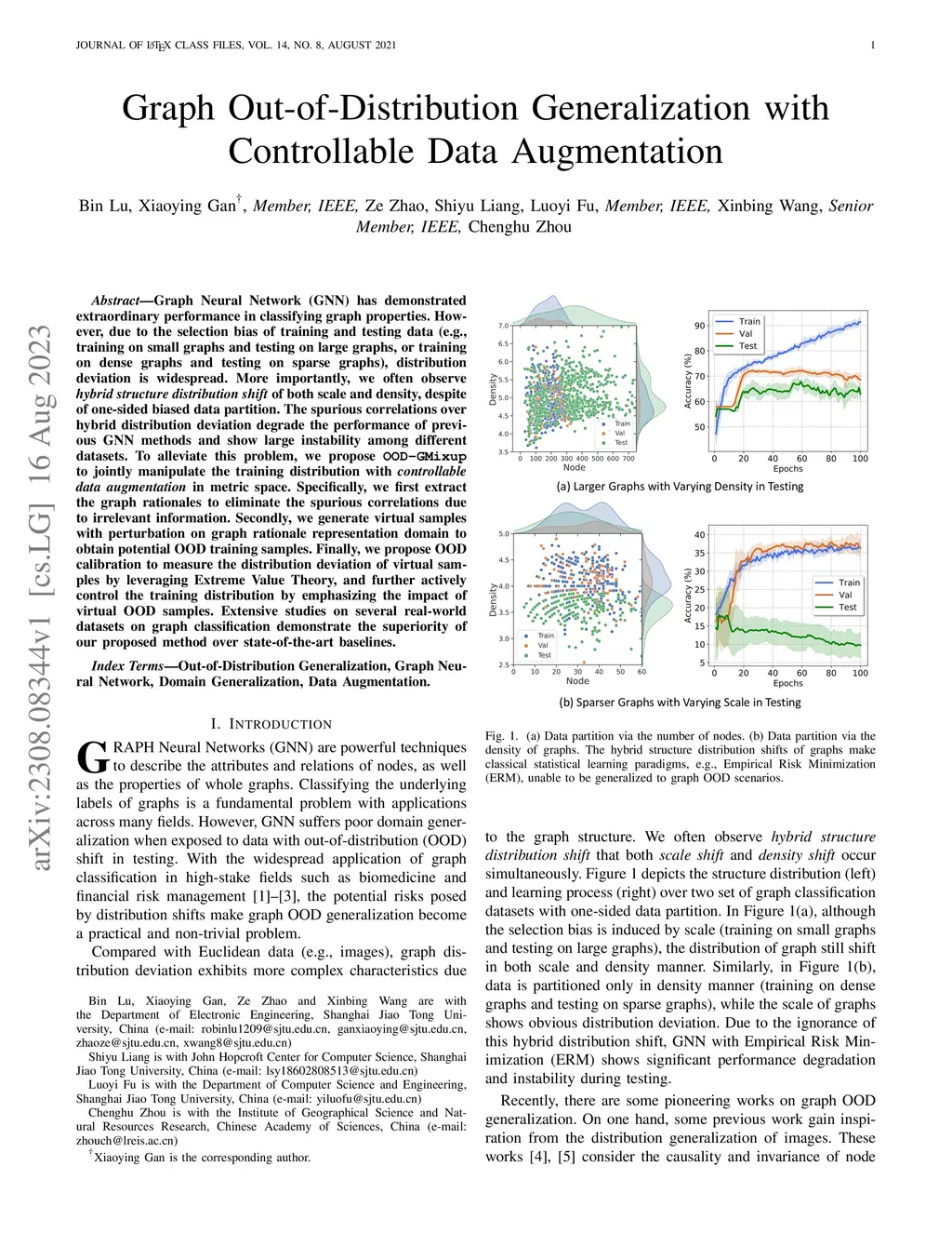 Graph Neural Network (GNN) has demonstrated extraordinary performance in classifying graph properties. However, due to the selection bias of training and testing data (e.g., training on small graphs and testing on large graphs, or training on dense graphs and testing on sparse graphs), distribution deviation is widespread. More importantly, we often observe \emph{hybrid structure distribution shift} of both scale and density, despite of one-sided biased data partition. The spurious correlations over hybrid distribution deviation degrade the performance of previous GNN methods and show large instability among different datasets. To alleviate this problem, we propose \texttt{OOD-GMixup} to jointly manipulate the training distribution with \emph{controllable data augmentation} in metric space. Specifically, we first extract the graph rationales to eliminate the spurious correlations due to irrelevant information. Secondly, we generate virtual samples with perturbation on graph rationale representation domain to obtain potential OOD training samples. Finally, we propose OOD calibration to measure the distribution deviation of virtual samples by leveraging Extreme Value Theory, and further actively control the training distribution by emphasizing the impact of virtual OOD samples. Extensive studies on several real-world datasets on graph classification demonstrate the superiority of our proposed method over state-of-the-art baselines.