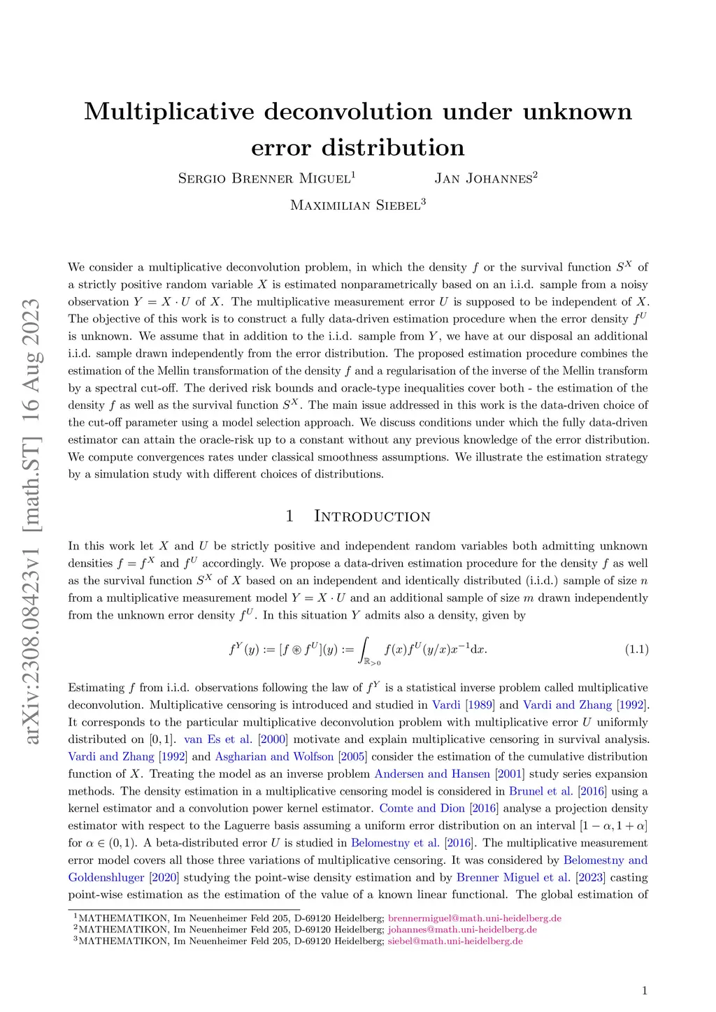 We consider a multiplicative deconvolution problem, in which the density or the survival function of a strictly positive random variable is estimated nonparametrically based on an i.i.d. sample from a noisy observation of . The multiplicative measurement error is supposed to be independent of . The objective of this work is to construct a fully data-driven estimation procedure when the error density is unknown. We assume that in addition to the i.i.d. sample from , we have at our disposal an additional i.i.d. sample drawn independently from the error distribution. The proposed estimation procedure combines the estimation of the Mellin transformation of the density and a regularisation of the inverse of the Mellin transform by a spectral cut-off. The derived risk bounds and oracle-type inequalities cover both - the estimation of the density as well as the survival function . The main issue addressed in this work is the data-driven choice of the cut-off parameter using a model selection approach. We discuss conditions under which the fully data-driven estimator can attain the oracle-risk up to a constant without any previous knowledge of the error distribution. We compute convergences rates under classical smoothness assumptions. We illustrate the estimation strategy by a simulation study with different choices of distributions.