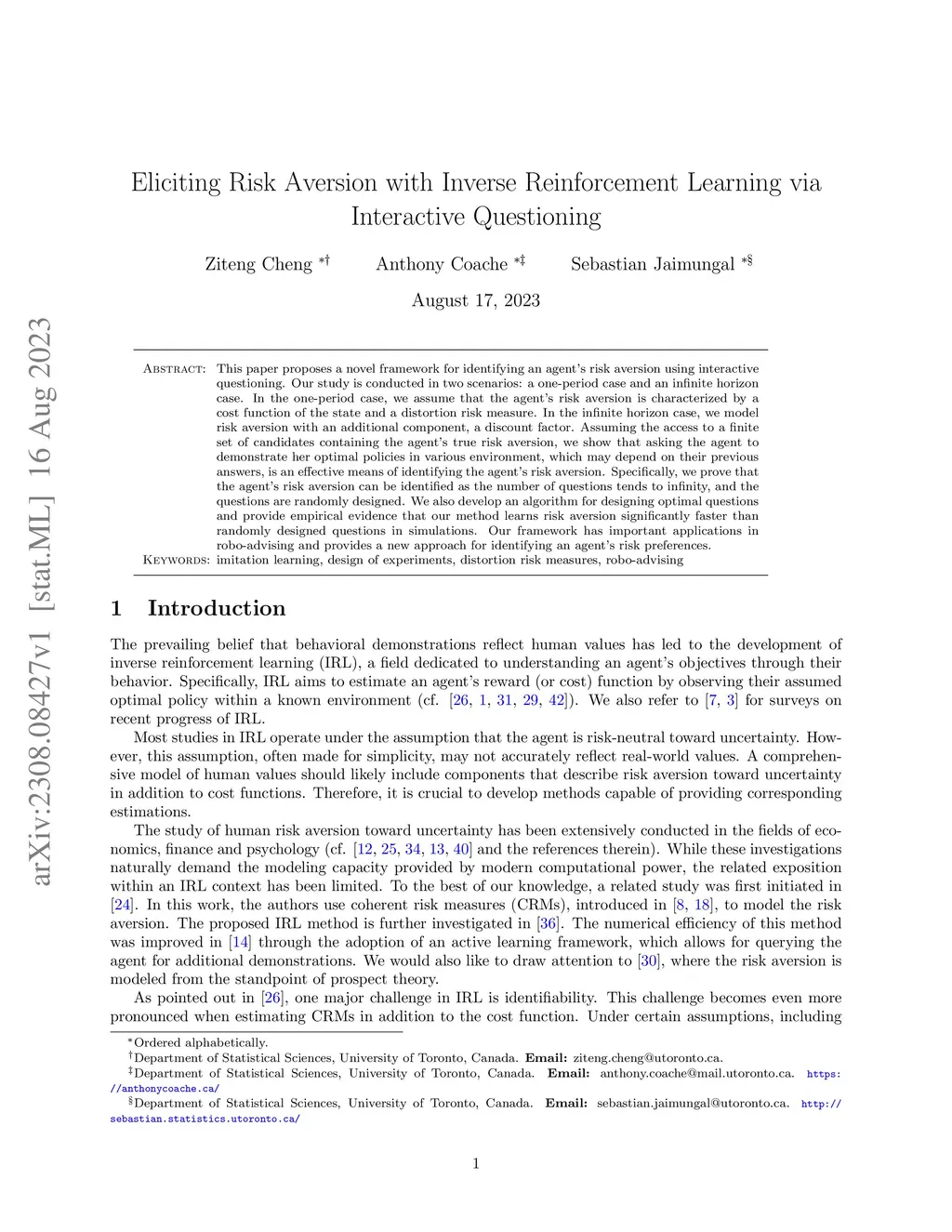 We investigate a framework for robo-advisors to estimate non-expert clients' risk aversion using adaptive binary-choice questionnaires. We model risk aversion using cost functions and spectral risk measures in a static setting. We prove the finite-sample identifiability and, for properly designed questions, obtain a convergence rate of up to a logarithmic factor, where is the number of questions. We introduce the notion of distinguishing power and demonstrate, through simulated experiments, that designing questions by maximizing distinguishing power achieves satisfactory accuracy in learning risk aversion with fewer than 50 questions. We also provide a preliminary investigation of an infinite-horizon setting with an additional discount factor for dynamic risk aversion, establishing qualitative identifiability in this case.