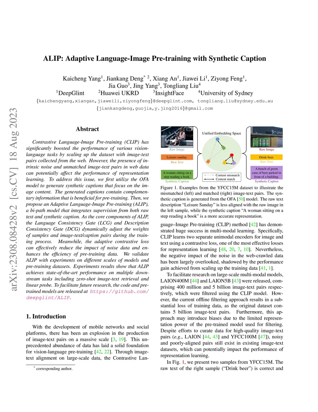 Contrastive Language-Image Pre-training (CLIP) has significantly boosted the performance of various vision-language tasks by scaling up the dataset with image-text pairs collected from the web. However, the presence of intrinsic noise and unmatched image-text pairs in web data can potentially affect the performance of representation learning. To address this issue, we first utilize the OFA model to generate synthetic captions that focus on the image content. The generated captions contain complementary information that is beneficial for pre-training. Then, we propose an Adaptive Language-Image Pre-training (ALIP), a bi-path model that integrates supervision from both raw text and synthetic caption. As the core components of ALIP, the Language Consistency Gate (LCG) and Description Consistency Gate (DCG) dynamically adjust the weights of samples and image-text/caption pairs during the training process. Meanwhile, the adaptive contrastive loss can effectively reduce the impact of noise data and enhances the efficiency of pre-training data. We validate ALIP with experiments on different scales of models and pre-training datasets. Experiments results show that ALIP achieves state-of-the-art performance on multiple downstream tasks including zero-shot image-text retrieval and linear probe. To facilitate future research, the code and pre-trained models are released at https://github.com/deepglint/ALIP.