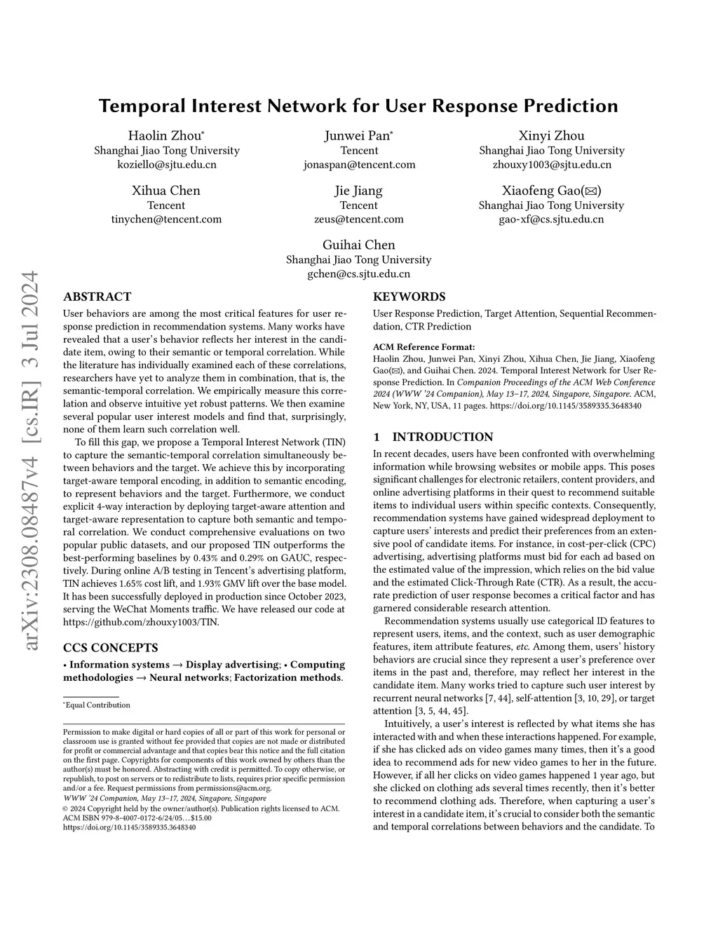 User response prediction is essential in industrial recommendation systems, such as online display advertising. Among all the features in recommendation models, user behaviors are among the most critical. Many works have revealed that a user's behavior reflects her interest in the candidate item, owing to the semantic or temporal correlation between behaviors and the candidate. While the literature has individually examined each of these correlations, researchers have yet to analyze them in combination, that is, the semantic-temporal correlation. We empirically measure this correlation and observe intuitive yet robust patterns. We then examine several popular user interest models and find that, surprisingly, none of them learn such correlation well. To fill this gap, we propose a Temporal Interest Network (TIN) to capture the semantic-temporal correlation simultaneously between behaviors and the target. We achieve this by incorporating target-aware temporal encoding, in addition to semantic encoding, to represent behaviors and the target. Furthermore, we conduct explicit 4-way interaction by deploying target-aware attention and target-aware representation to capture both semantic and temporal correlation. We conduct comprehensive evaluations on two popular public datasets, and our proposed TIN outperforms the best-performing baselines by 0.43% and 0.29% on GAUC, respectively. During online A/B testing in Tencent's advertising platform, TIN achieves 1.65% cost lift and 1.93% GMV lift over the base model. It has been successfully deployed in production since October 2023, serving the WeChat Moments traffic. We have released our code at https://github.com/zhouxy1003/TIN.