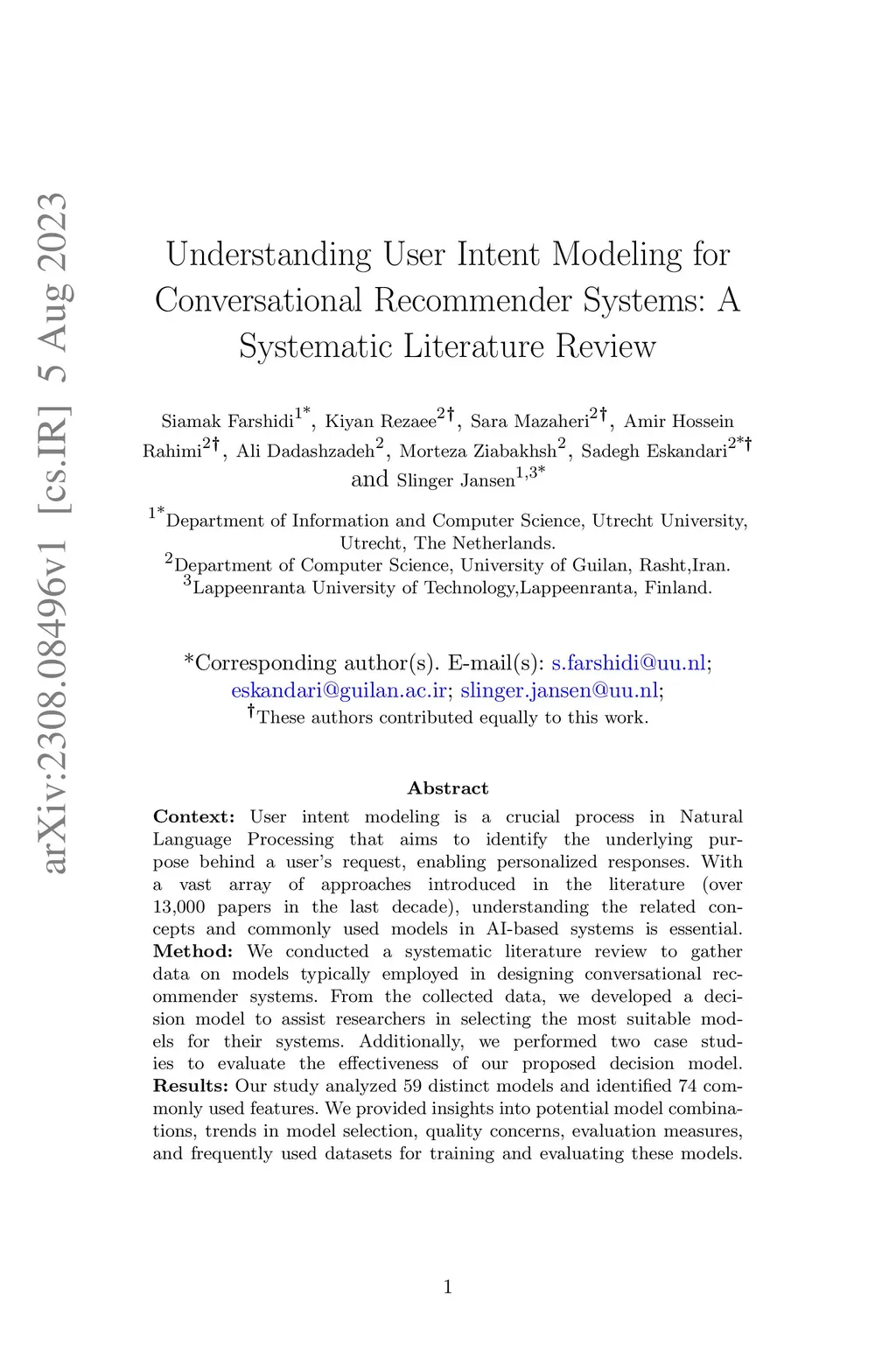 Context: User intent modeling is a crucial process in Natural Language Processing that aims to identify the underlying purpose behind a user's request, enabling personalized responses. With a vast array of approaches introduced in the literature (over 13,000 papers in the last decade), understanding the related concepts and commonly used models in AI-based systems is essential. Method: We conducted a systematic literature review to gather data on models typically employed in designing conversational recommender systems. From the collected data, we developed a decision model to assist researchers in selecting the most suitable models for their systems. Additionally, we performed two case studies to evaluate the effectiveness of our proposed decision model. Results: Our study analyzed 59 distinct models and identified 74 commonly used features. We provided insights into potential model combinations, trends in model selection, quality concerns, evaluation measures, and frequently used datasets for training and evaluating these models. Contribution: Our study contributes practical insights and a comprehensive understanding of user intent modeling, empowering the development of more effective and personalized conversational recommender systems. With the Conversational Recommender System, researchers can perform a more systematic and efficient assessment of fitting intent modeling frameworks.
