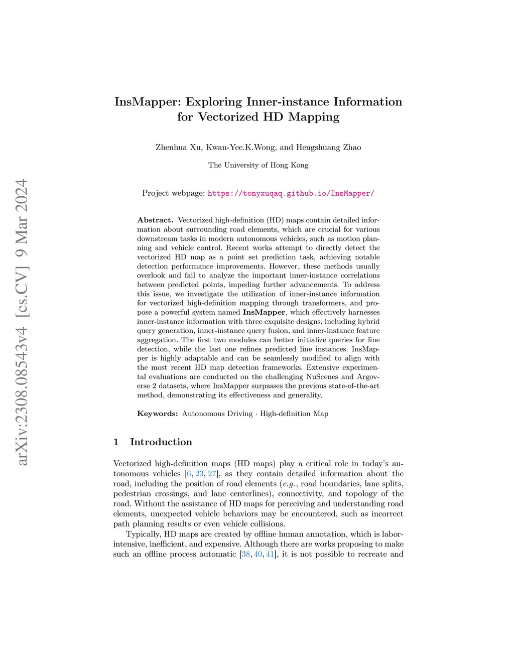 Vectorized high-definition (HD) maps contain detailed information about surrounding road elements, which are crucial for various downstream tasks in modern autonomous driving vehicles, such as vehicle planning and control. Recent works have attempted to directly detect the vectorized HD map as a point set prediction task, resulting in significant improvements in detection performance. However, these approaches fail to analyze and exploit the inner-instance correlations between predicted points, impeding further advancements. To address these challenges, we investigate the utilization of inner-tance information for vectorized h-definition mapping through ransformers and introduce InsightMapper. This paper presents three novel designs within InsightMapper that leverage inner-instance information in distinct ways, including hybrid query generation, inner-instance query fusion, and inner-instance feature aggregation. Comparative experiments are conducted on the NuScenes dataset, showcasing the superiority of our proposed method. InsightMapper surpasses previous state-of-the-art (SOTA) methods by 5.78 mAP and 5.12 TOPO, which assess topology correctness. Simultaneously, InsightMapper maintains high efficiency during both training and inference phases, resulting in remarkable comprehensive performance. The project page for this work is available at https://tonyxuqaq.github.io/InsightMapper/ .