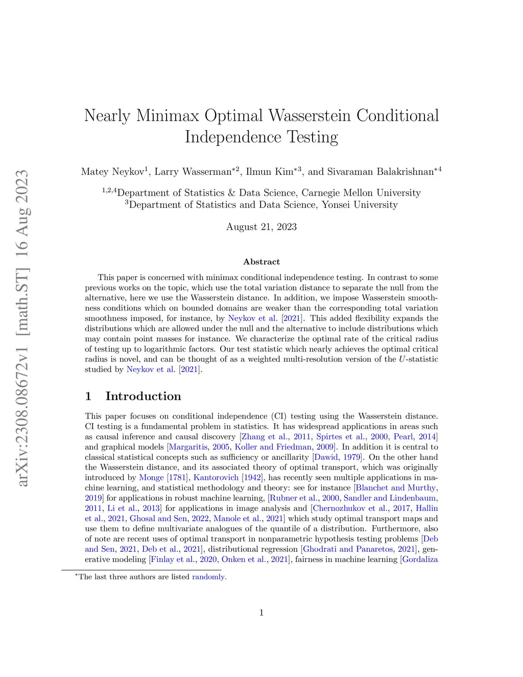 This paper is concerned with minimax conditional independence testing. In contrast to some previous works on the topic, which use the total variation distance to separate the null from the alternative, here we use the Wasserstein distance. In addition, we impose Wasserstein smoothness conditions which on bounded domains are weaker than the corresponding total variation smoothness imposed, for instance, by Neykov et al. [2021]. This added flexibility expands the distributions which are allowed under the null and the alternative to include distributions which may contain point masses for instance. We characterize the optimal rate of the critical radius of testing up to logarithmic factors. Our test statistic which nearly achieves the optimal critical radius is novel, and can be thought of as a weighted multi-resolution version of the U-statistic studied by Neykov et al. [2021].
