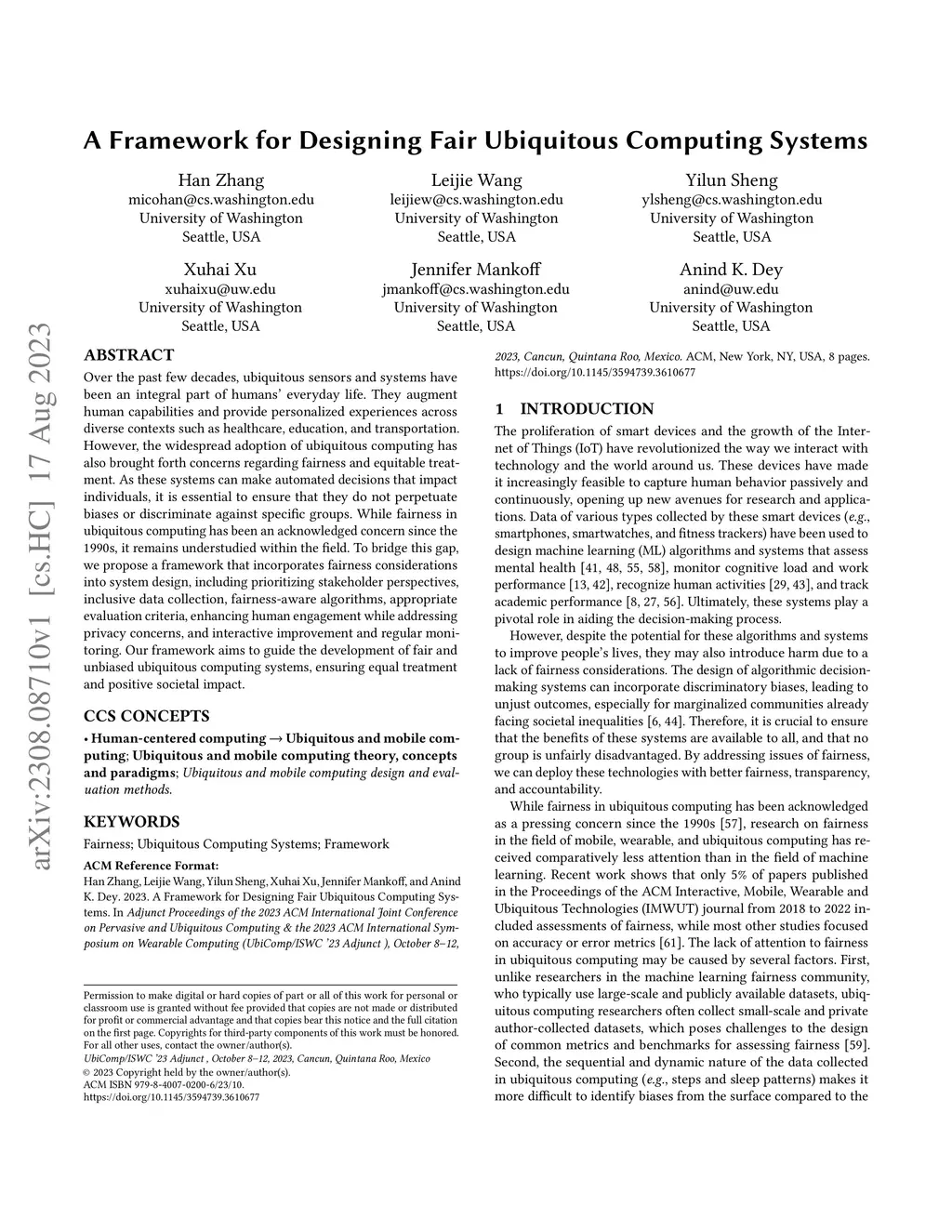 Over the past few decades, ubiquitous sensors and systems have been an integral part of humans' everyday life. They augment human capabilities and provide personalized experiences across diverse contexts such as healthcare, education, and transportation. However, the widespread adoption of ubiquitous computing has also brought forth concerns regarding fairness and equitable treatment. As these systems can make automated decisions that impact individuals, it is essential to ensure that they do not perpetuate biases or discriminate against specific groups. While fairness in ubiquitous computing has been an acknowledged concern since the 1990s, it remains understudied within the field. To bridge this gap, we propose a framework that incorporates fairness considerations into system design, including prioritizing stakeholder perspectives, inclusive data collection, fairness-aware algorithms, appropriate evaluation criteria, enhancing human engagement while addressing privacy concerns, and interactive improvement and regular monitoring. Our framework aims to guide the development of fair and unbiased ubiquitous computing systems, ensuring equal treatment and positive societal impact.