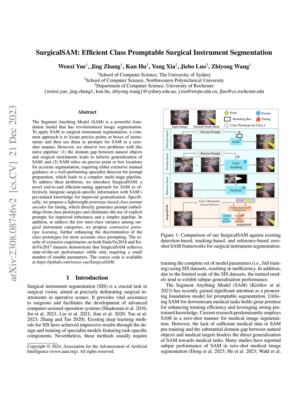 The Segment Anything Model (SAM) is a powerful foundation model that has revolutionised image segmentation. To apply SAM to surgical instrument segmentation, a common approach is to locate precise points or boxes of instruments and then use them as prompts for SAM in a zero-shot manner. However, we observe two problems with this naive pipeline: (1) the domain gap between natural objects and surgical instruments leads to inferior generalisation of SAM; and (2) SAM relies on precise point or box locations for accurate segmentation, requiring either extensive manual guidance or a well-performing specialist detector for prompt preparation, which leads to a complex multi-stage pipeline. To address these problems, we introduce SurgicalSAM, a novel end-to-end efficient-tuning approach for SAM to effectively integrate surgical-specific information with SAM's pre-trained knowledge for improved generalisation. Specifically, we propose a lightweight prototype-based class prompt encoder for tuning, which directly generates prompt embeddings from class prototypes and eliminates the use of explicit prompts for improved robustness and a simpler pipeline. In addition, to address the low inter-class variance among surgical instrument categories, we propose contrastive prototype learning, further enhancing the discrimination of the class prototypes for more accurate class prompting. The results of extensive experiments on both EndoVis2018 and EndoVis2017 datasets demonstrate that SurgicalSAM achieves state-of-the-art performance while only requiring a small number of tunable parameters. The source code is available at https://github.com/wenxi-yue/SurgicalSAM.