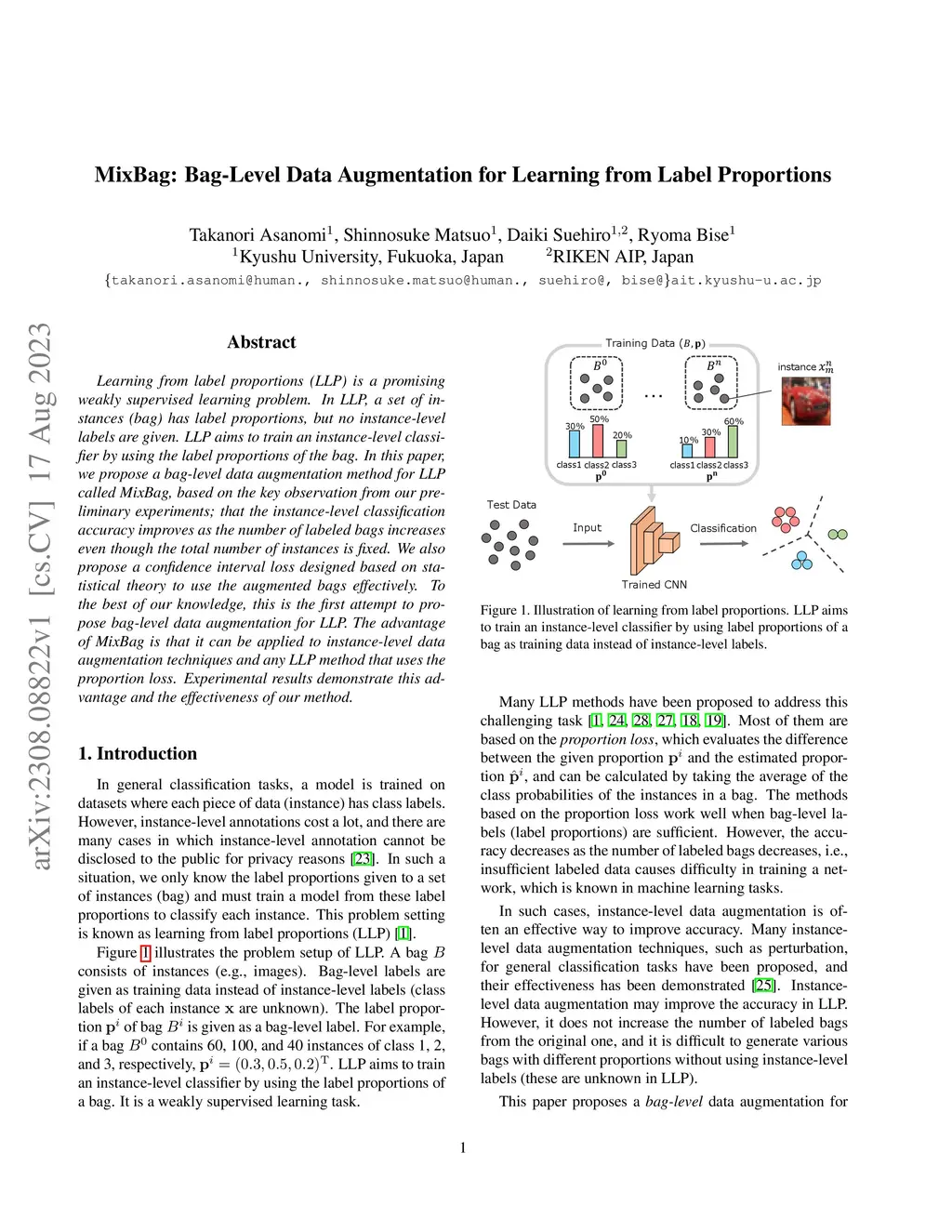 Learning from label proportions (LLP) is a promising weakly supervised learning problem. In LLP, a set of instances (bag) has label proportions, but no instance-level labels are given. LLP aims to train an instance-level classifier by using the label proportions of the bag. In this paper, we propose a bag-level data augmentation method for LLP called MixBag, based on the key observation from our preliminary experiments; that the instance-level classification accuracy improves as the number of labeled bags increases even though the total number of instances is fixed. We also propose a confidence interval loss designed based on statistical theory to use the augmented bags effectively. To the best of our knowledge, this is the first attempt to propose bag-level data augmentation for LLP. The advantage of MixBag is that it can be applied to instance-level data augmentation techniques and any LLP method that uses the proportion loss. Experimental results demonstrate this advantage and the effectiveness of our method.
