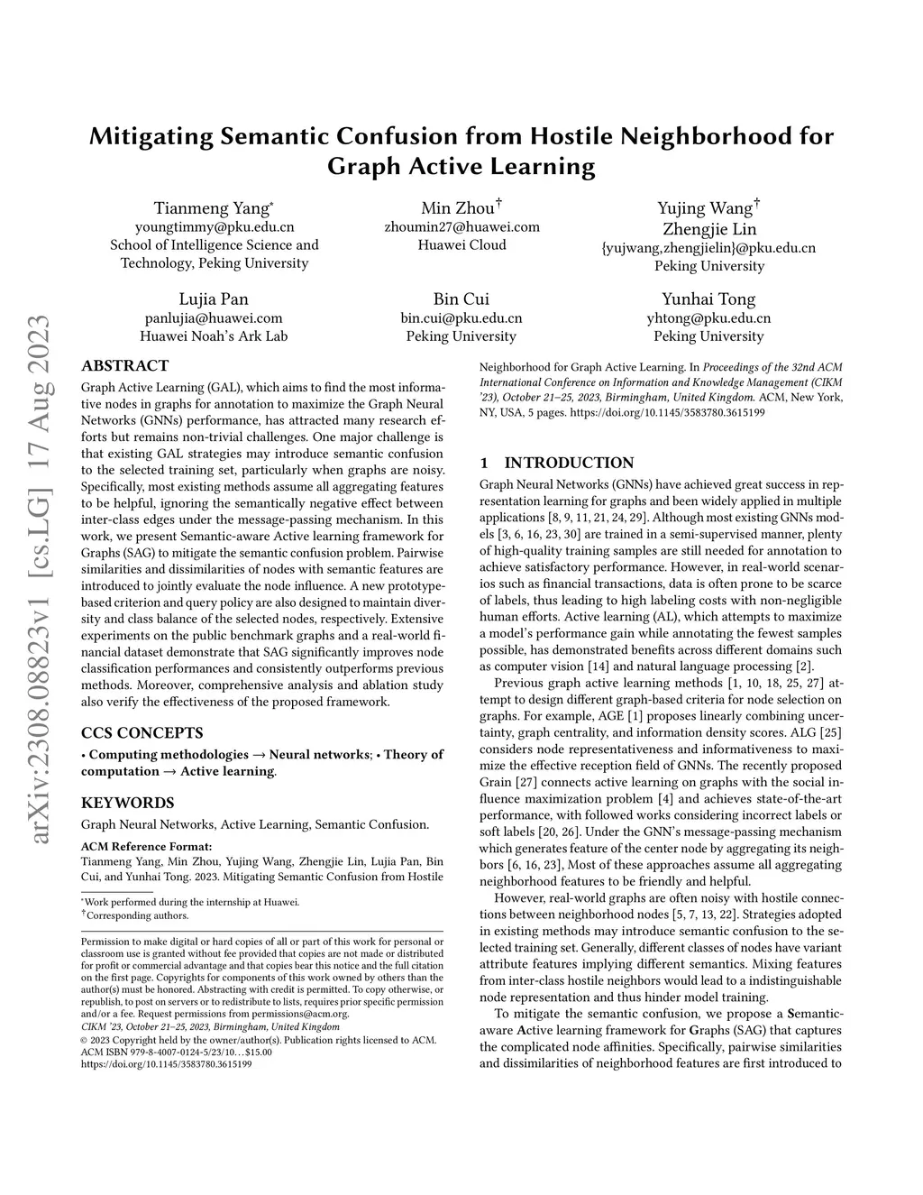 Graph Active Learning (GAL), which aims to find the most informative nodes in graphs for annotation to maximize the Graph Neural Networks (GNNs) performance, has attracted many research efforts but remains non-trivial challenges. One major challenge is that existing GAL strategies may introduce semantic confusion to the selected training set, particularly when graphs are noisy. Specifically, most existing methods assume all aggregating features to be helpful, ignoring the semantically negative effect between inter-class edges under the message-passing mechanism. In this work, we present Semantic-aware Active learning framework for Graphs (SAG) to mitigate the semantic confusion problem. Pairwise similarities and dissimilarities of nodes with semantic features are introduced to jointly evaluate the node influence. A new prototype-based criterion and query policy are also designed to maintain diversity and class balance of the selected nodes, respectively. Extensive experiments on the public benchmark graphs and a real-world financial dataset demonstrate that SAG significantly improves node classification performances and consistently outperforms previous methods. Moreover, comprehensive analysis and ablation study also verify the effectiveness of the proposed framework.