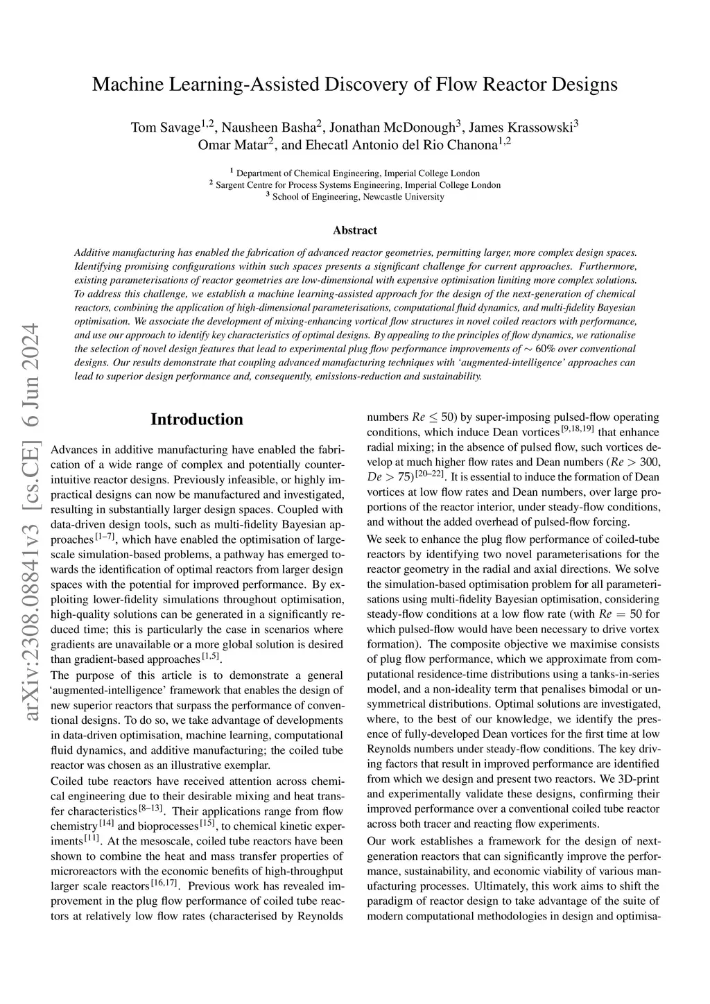 Additive manufacturing has enabled the fabrication of advanced reactor geometries, permitting larger, more complex design spaces. Identifying promising configurations within such spaces presents a significant challenge for current approaches. Furthermore, existing parameterisations of reactor geometries are low-dimensional with expensive optimisation limiting more complex solutions. To address this challenge, we establish a machine learning-assisted approach for the design of the next-generation of chemical reactors, combining the application of high-dimensional parameterisations, computational fluid dynamics, and multi-fidelity Bayesian optimisation. We associate the development of mixing-enhancing vortical flow structures in novel coiled reactors with performance, and use our approach to identify key characteristics of optimal designs. By appealing to the principles of flow dynamics, we rationalise the selection of novel design features that lead to experimental plug flow performance improvements of 60% over conventional designs. Our results demonstrate that coupling advanced manufacturing techniques with `augmented-intelligence' approaches can lead to superior design performance and, consequently, emissions-reduction and sustainability.