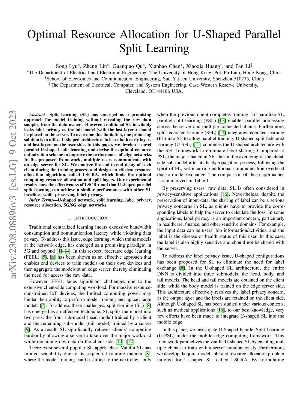 Split learning (SL) has emerged as a promising approach for model training without revealing the raw data samples from the data owners. However, traditional SL inevitably leaks label privacy as the tail model (with the last layers) should be placed on the server. To overcome this limitation, one promising solution is to utilize U-shaped architecture to leave both early layers and last layers on the user side. In this paper, we develop a novel parallel U-shaped split learning and devise the optimal resource optimization scheme to improve the performance of edge networks. In the proposed framework, multiple users communicate with an edge server for SL. We analyze the end-to-end delay of each client during the training process and design an efficient resource allocation algorithm, called LSCRA, which finds the optimal computing resource allocation and split layers. Our experimental results show the effectiveness of LSCRA and that U-shaped parallel split learning can achieve a similar performance with other SL baselines while preserving label privacy. Index Terms: U-shaped network, split learning, label privacy, resource allocation, 5G/6G edge networks.
