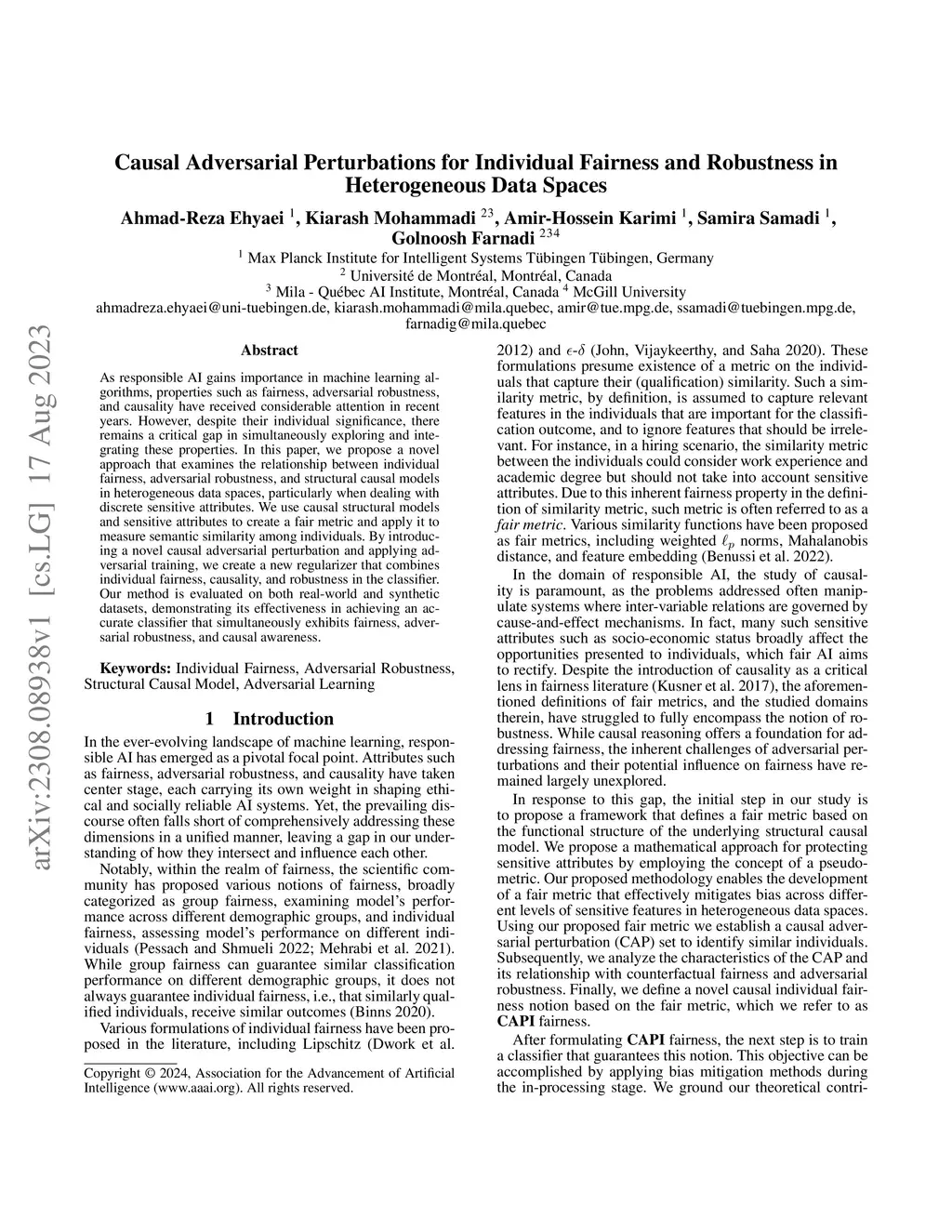 As responsible AI gains importance in machine learning algorithms, properties such as fairness, adversarial robustness, and causality have received considerable attention in recent years. However, despite their individual significance, there remains a critical gap in simultaneously exploring and integrating these properties. In this paper, we propose a novel approach that examines the relationship between individual fairness, adversarial robustness, and structural causal models in heterogeneous data spaces, particularly when dealing with discrete sensitive attributes. We use causal structural models and sensitive attributes to create a fair metric and apply it to measure semantic similarity among individuals. By introducing a novel causal adversarial perturbation and applying adversarial training, we create a new regularizer that combines individual fairness, causality, and robustness in the classifier. Our method is evaluated on both real-world and synthetic datasets, demonstrating its effectiveness in achieving an accurate classifier that simultaneously exhibits fairness, adversarial robustness, and causal awareness.