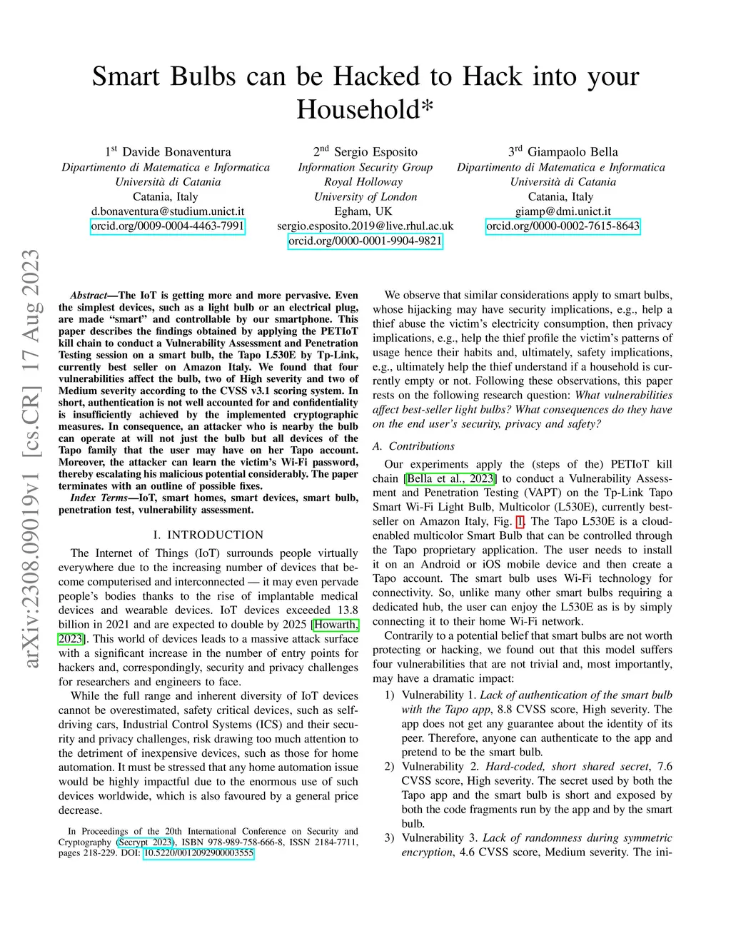 The IoT is getting more and more pervasive. Even the simplest devices, such as a light bulb or an electrical plug, are made "smart" and controllable by our smartphone. This paper describes the findings obtained by applying the PETIoT kill chain to conduct a Vulnerability Assessment and Penetration Testing session on a smart bulb, the Tapo L530E by Tp-Link, currently best seller on Amazon Italy. We found that four vulnerabilities affect the bulb, two of High severity and two of Medium severity according to the CVSS v3.1 scoring system. In short, authentication is not well accounted for and confidentiality is insufficiently achieved by the implemented cryptographic measures. In consequence, an attacker who is nearby the bulb can operate at will not just the bulb but all devices of the Tapo family that the user may have on her Tapo account. Moreover, the attacker can learn the victim's Wi-Fi password, thereby escalating his malicious potential considerably. The paper terminates with an outline of possible fixes.