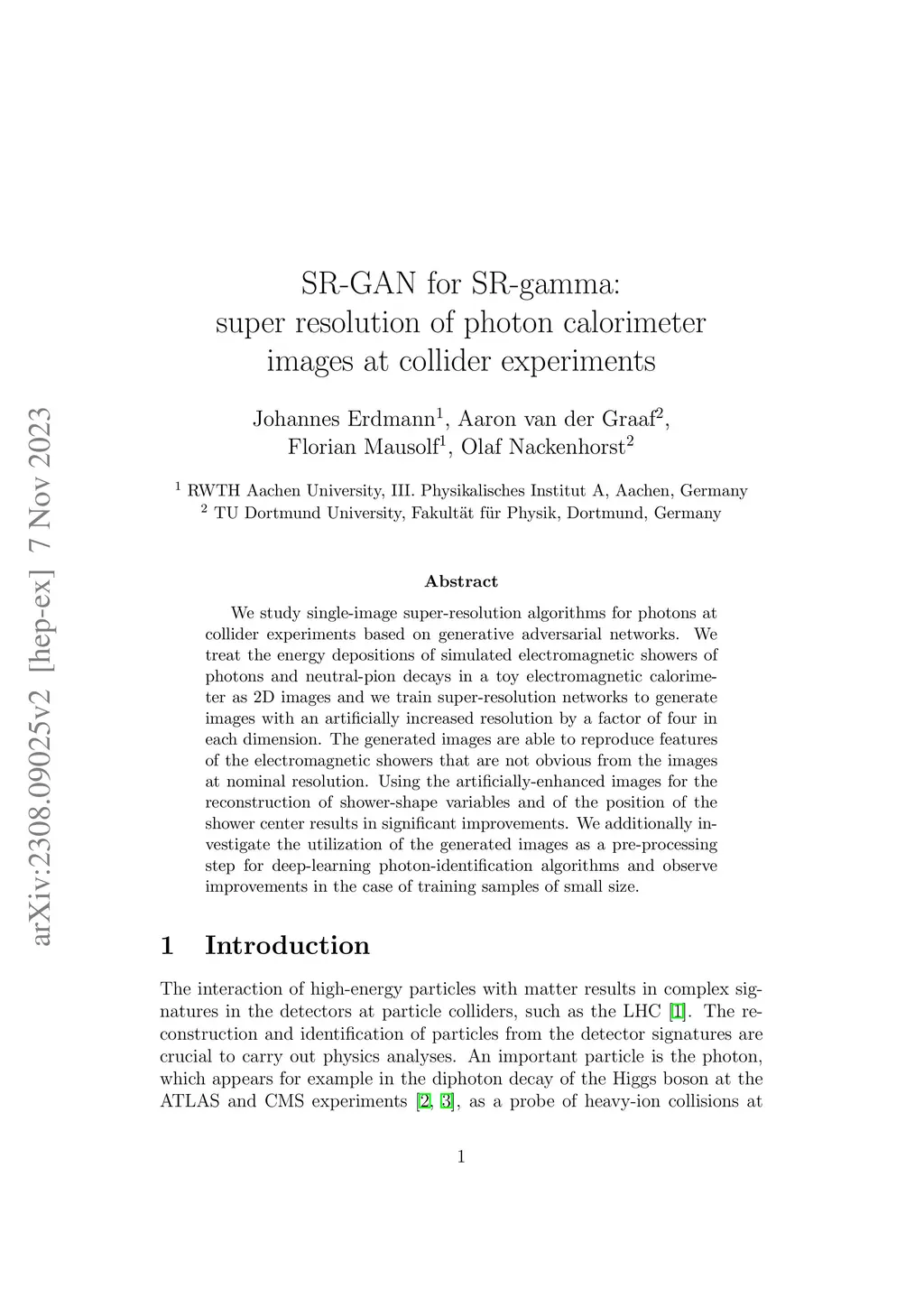 We study single-image super-resolution algorithms for photons at collider experiments based on generative adversarial networks. We treat the energy depositions of simulated electromagnetic showers of photons and neutral-pion decays in a toy electromagnetic calorimeter as 2D images and we train super-resolution networks to generate images with an artificially increased resolution by a factor of four in each dimension. The generated images are able to reproduce features of the electromagnetic showers that are not obvious from the images at nominal resolution. Using the artificially-enhanced images for the reconstruction of shower-shape variables and of the position of the shower center results in significant improvements. We additionally investigate the utilization of the generated images as a pre-processing step for deep-learning photon-identification algorithms and observe improvements in the case of training samples of small size.