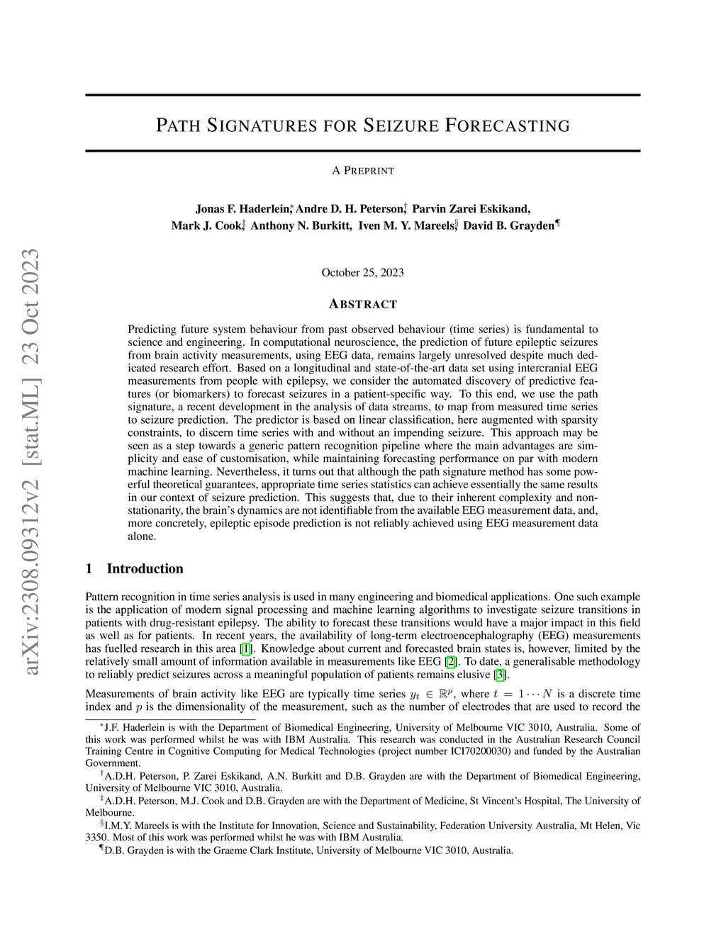 Predicting future system behaviour from past observed behaviour (time series) is fundamental to science and engineering. In computational neuroscience, the prediction of future epileptic seizures from brain activity measurements, using EEG data, remains largely unresolved despite much dedicated research effort. Based on a longitudinal and state-of-the-art data set using intercranial EEG measurements from people with epilepsy, we consider the automated discovery of predictive features (or biomarkers) to forecast seizures in a patient-specific way. To this end, we use the path signature, a recent development in the analysis of data streams, to map from measured time series to seizure prediction. The predictor is based on linear classification, here augmented with sparsity constraints, to discern time series with and without an impending seizure. This approach may be seen as a step towards a generic pattern recognition pipeline where the main advantages are simplicity and ease of customisation, while maintaining forecasting performance on par with modern machine learning. Nevertheless, it turns out that although the path signature method has some powerful theoretical guarantees, appropriate time series statistics can achieve essentially the same results in our context of seizure prediction. This suggests that, due to their inherent complexity and non-stationarity, the brain's dynamics are not identifiable from the available EEG measurement data, and, more concretely, epileptic episode prediction is not reliably achieved using EEG measurement data alone.