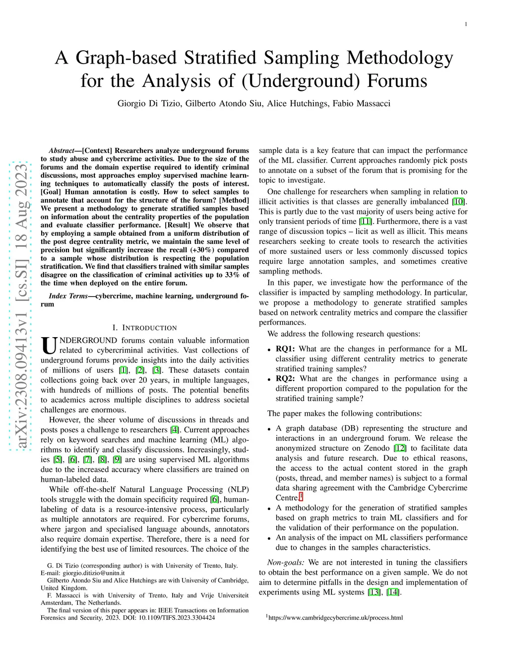 [Context] Researchers analyze underground forums to study abuse and cybercrime activities. Due to the size of the forums and the domain expertise required to identify criminal discussions, most approaches employ supervised machine learning techniques to automatically classify the posts of interest. [Goal] Human annotation is costly. How to select samples to annotate that account for the structure of the forum? [Method] We present a methodology to generate stratified samples based on information about the centrality properties of the population and evaluate classifier performance. [Result] We observe that by employing a sample obtained from a uniform distribution of the post degree centrality metric, we maintain the same level of precision but significantly increase the recall (+30%) compared to a sample whose distribution is respecting the population stratification. We find that classifiers trained with similar samples disagree on the classification of criminal activities up to 33% of the time when deployed on the entire forum.