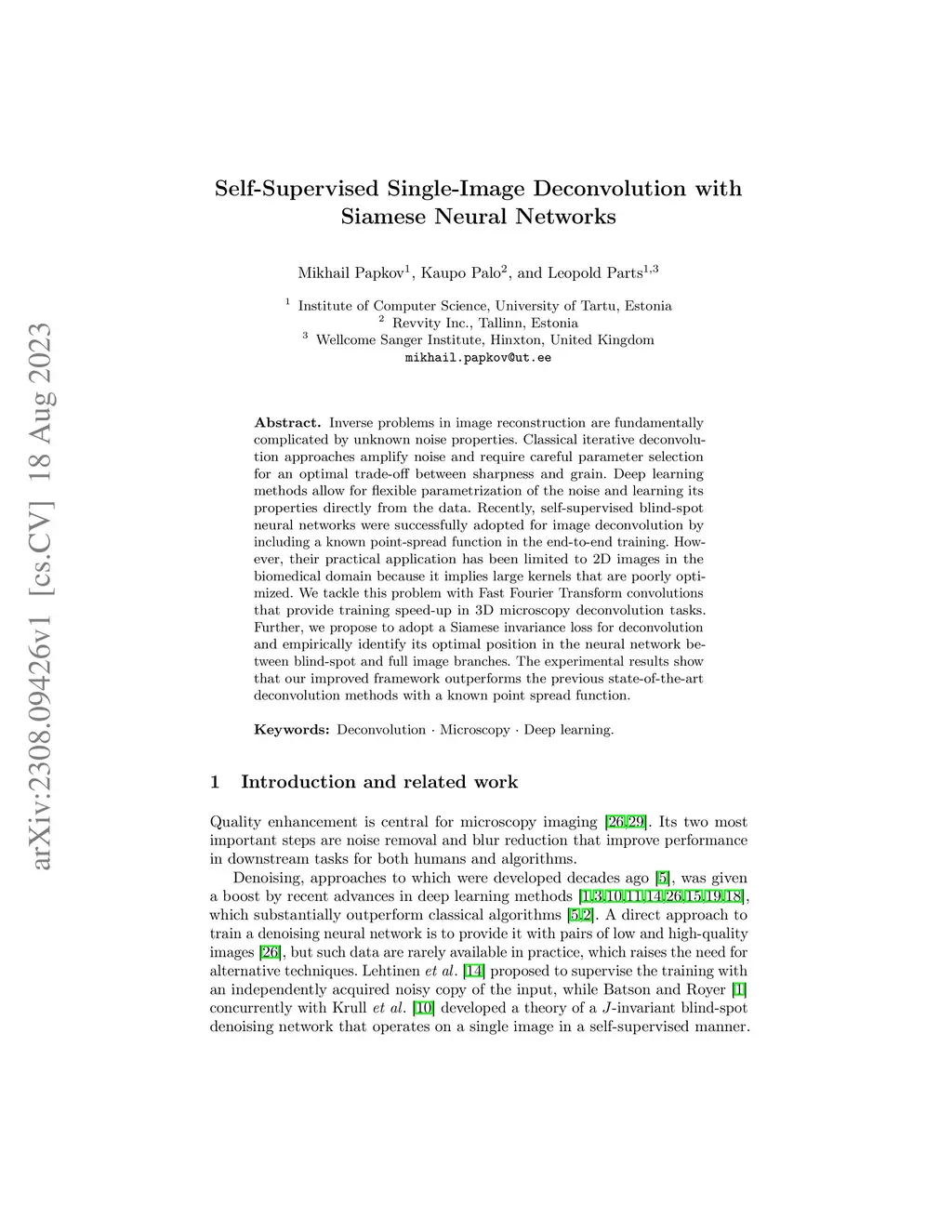 Inverse problems in image reconstruction are fundamentally complicated by unknown noise properties. Classical iterative deconvolution approaches amplify noise and require careful parameter selection for an optimal trade-off between sharpness and grain. Deep learning methods allow for flexible parametrization of the noise and learning its properties directly from the data. Recently, self-supervised blind-spot neural networks were successfully adopted for image deconvolution by including a known point-spread function in the end-to-end training. However, their practical application has been limited to 2D images in the biomedical domain because it implies large kernels that are poorly optimized. We tackle this problem with Fast Fourier Transform convolutions that provide training speed-up in 3D microscopy deconvolution tasks. Further, we propose to adopt a Siamese invariance loss for deconvolution and empirically identify its optimal position in the neural network between blind-spot and full image branches. The experimental results show that our improved framework outperforms the previous state-of-the-art deconvolution methods with a known point spread function.