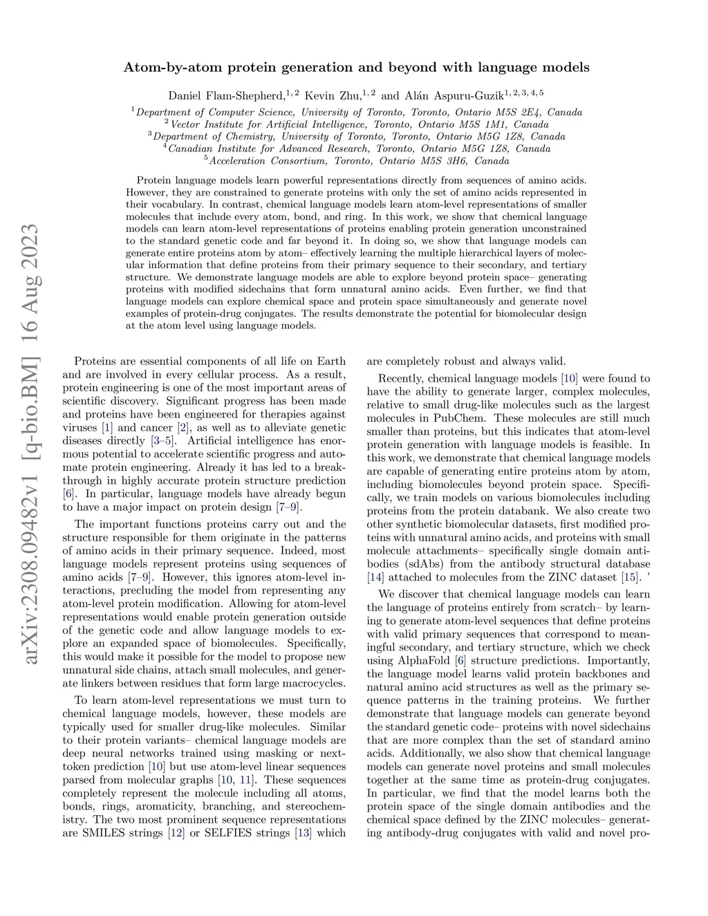 Protein language models learn powerful representations directly from sequences of amino acids. However, they are constrained to generate proteins with only the set of amino acids represented in their vocabulary. In contrast, chemical language models learn atom-level representations of smaller molecules that include every atom, bond, and ring. In this work, we show that chemical language models can learn atom-level representations of proteins enabling protein generation unconstrained to the standard genetic code and far beyond it. In doing so, we show that language models can generate entire proteins atom by atom -- effectively learning the multiple hierarchical layers of molecular information that define proteins from their primary sequence to their secondary, and tertiary structure. We demonstrate language models are able to explore beyond protein space -- generating proteins with modified sidechains that form unnatural amino acids. Even further, we find that language models can explore chemical space and protein space simultaneously and generate novel examples of protein-drug conjugates. The results demonstrate the potential for biomolecular design at the atom level using language models.
