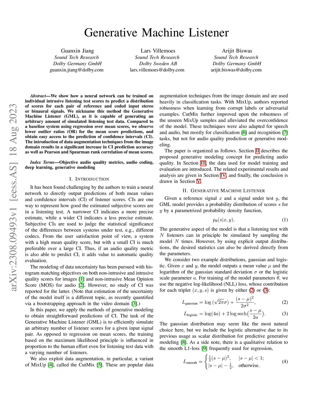 We show how a neural network can be trained on individual intrusive listening test scores to predict a distribution of scores for each pair of reference and coded input stereo or binaural signals. We nickname this method the Generative Machine Listener (GML), as it is capable of generating an arbitrary amount of simulated listening test data. Compared to a baseline system using regression over mean scores, we observe lower outlier ratios (OR) for the mean score predictions, and obtain easy access to the prediction of confidence intervals (CI). The introduction of data augmentation techniques from the image domain results in a significant increase in CI prediction accuracy as well as Pearson and Spearman rank correlation of mean scores.