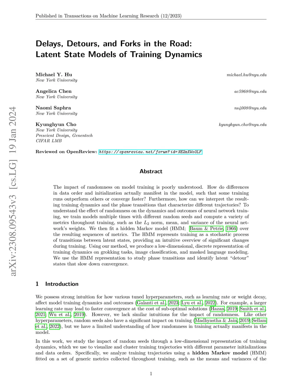 The impact of randomness on model training is poorly understood. How do differences in data order and initialization actually manifest in the model, such that some training runs outperform others or converge faster? Furthermore, how can we interpret the resulting training dynamics and the phase transitions that characterize different trajectories? To understand the effect of randomness on the dynamics and outcomes of neural network training, we train models multiple times with different random seeds and compute a variety of metrics throughout training, such as the L2L_2 norm, mean, and variance of the neural network's weights. We then fit a hidden Markov model (HMM) over the resulting sequences of metrics. The HMM represents training as a stochastic process of transitions between latent states, providing an intuitive overview of significant changes during training. Using our method, we produce a low-dimensional, discrete representation of training dynamics on grokking tasks, image classification, and masked language modeling. We use the HMM representation to study phase transitions and identify latent "detour" states that slow down convergence.