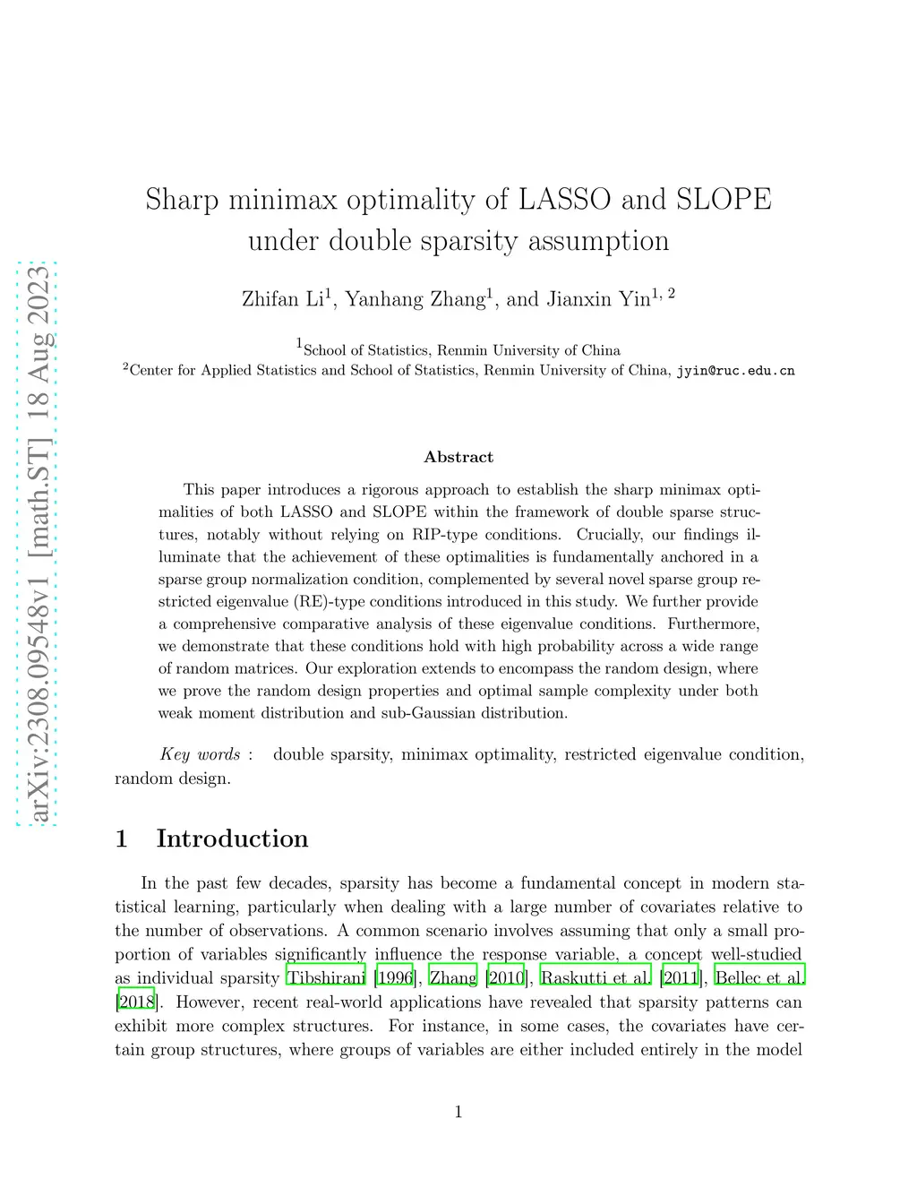 This paper introduces a rigorous approach to establish the sharp minimax optimalities of both LASSO and SLOPE within the framework of double sparse structures, notably without relying on RIP-type conditions. Crucially, our findings illuminate that the achievement of these optimalities is fundamentally anchored in a sparse group normalization condition, complemented by several novel sparse group restricted eigenvalue (RE)-type conditions introduced in this study. We further provide a comprehensive comparative analysis of these eigenvalue conditions. Furthermore, we demonstrate that these conditions hold with high probability across a wide range of random matrices. Our exploration extends to encompass the random design, where we prove the random design properties and optimal sample complexity under both weak moment distribution and sub-Gaussian distribution.