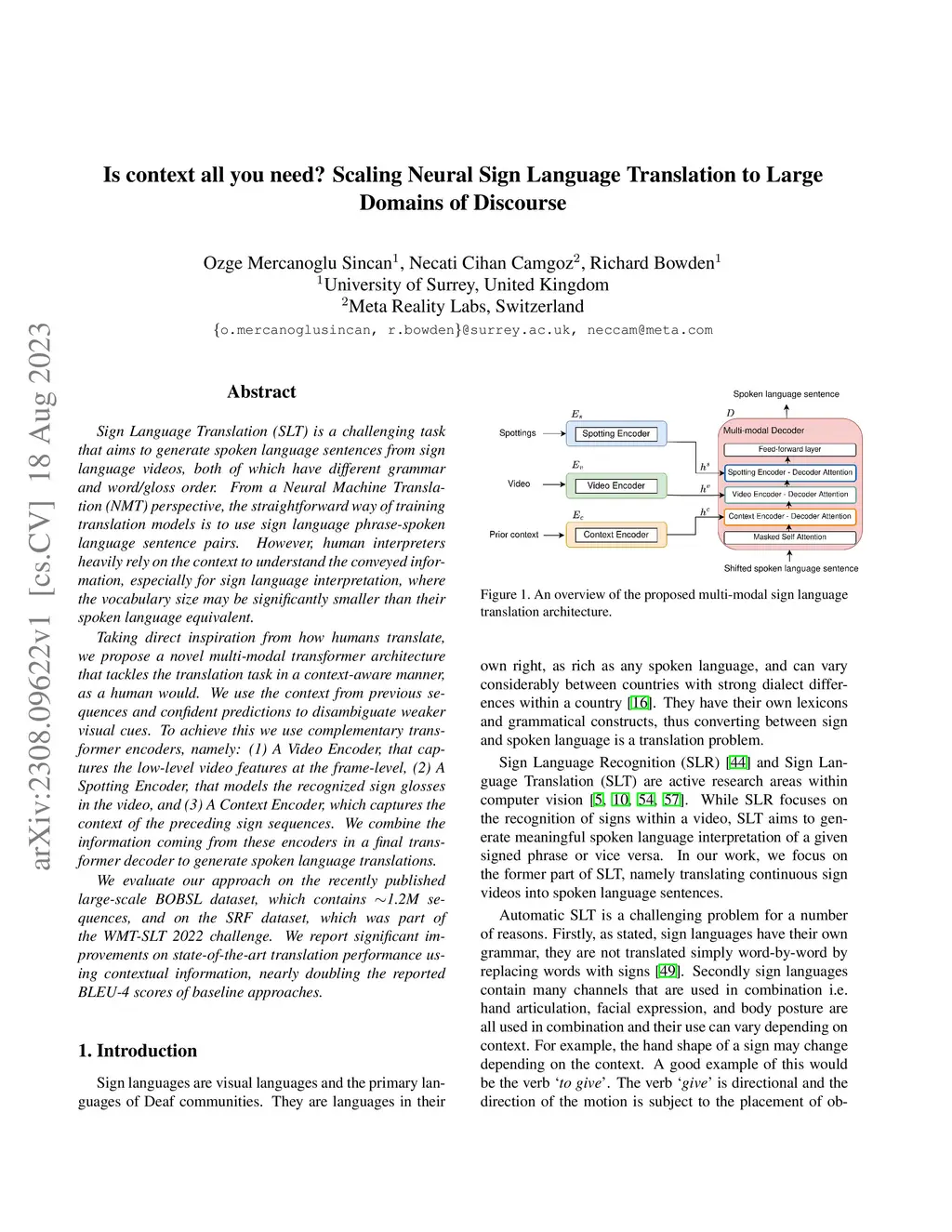 Sign Language Translation (SLT) is a challenging task that aims to generate spoken language sentences from sign language videos, both of which have different grammar and word/gloss order. From a Neural Machine Translation (NMT) perspective, the straightforward way of training translation models is to use sign language phrase-spoken language sentence pairs. However, human interpreters heavily rely on the context to understand the conveyed information, especially for sign language interpretation, where the vocabulary size may be significantly smaller than their spoken language equivalent. Taking direct inspiration from how humans translate, we propose a novel multi-modal transformer architecture that tackles the translation task in a context-aware manner, as a human would. We use the context from previous sequences and confident predictions to disambiguate weaker visual cues. To achieve this we use complementary transformer encoders, namely: (1) A Video Encoder, that captures the low-level video features at the frame-level, (2) A Spotting Encoder, that models the recognized sign glosses in the video, and (3) A Context Encoder, which captures the context of the preceding sign sequences. We combine the information coming from these encoders in a final transformer decoder to generate spoken language translations. We evaluate our approach on the recently published large-scale BOBSL dataset, which contains ~1.2M sequences, and on the SRF dataset, which was part of the WMT-SLT 2022 challenge. We report significant improvements on state-of-the-art translation performance using contextual information, nearly doubling the reported BLEU-4 scores of baseline approaches.