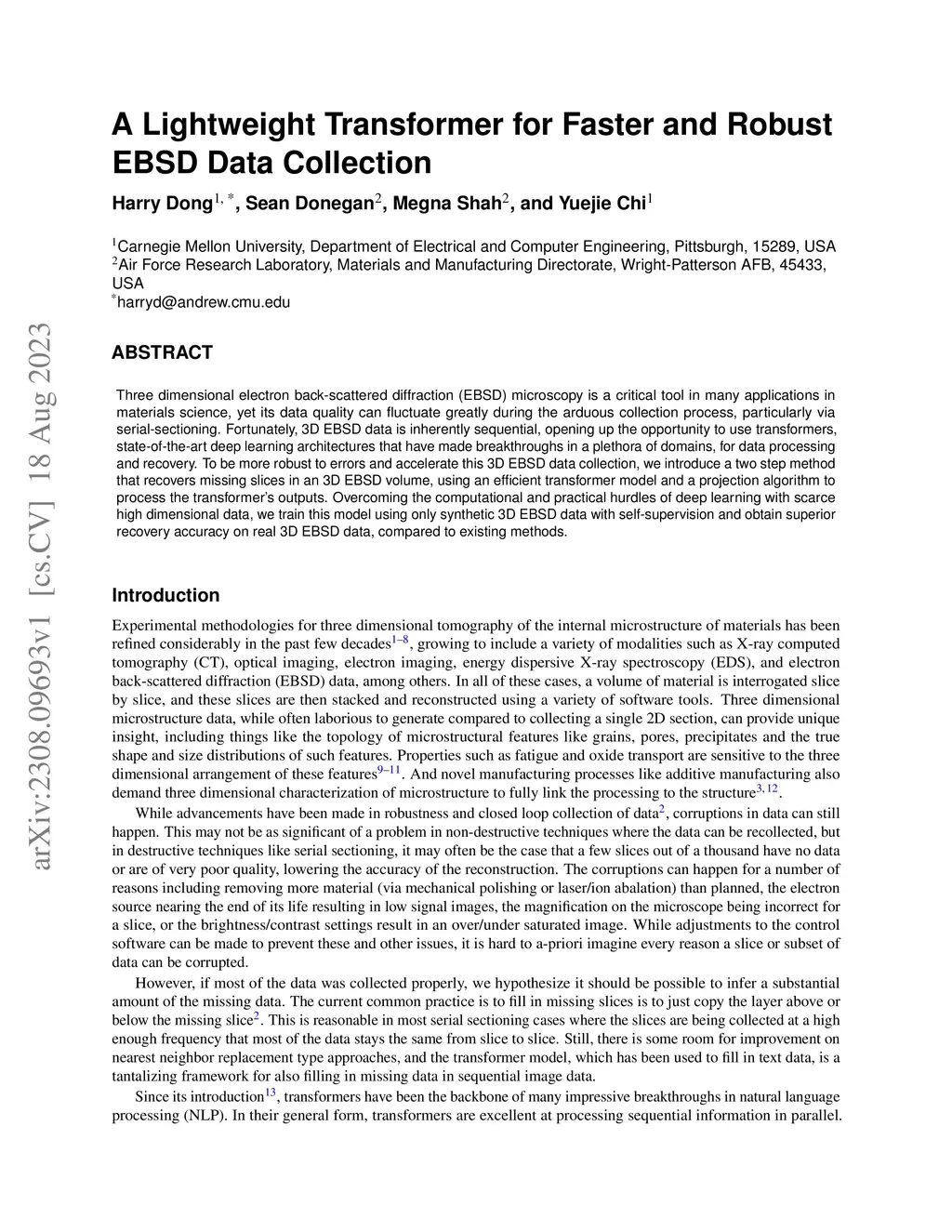 Three dimensional electron back-scattered diffraction (EBSD) microscopy is a critical tool in many applications in materials science, yet its data quality can fluctuate greatly during the arduous collection process, particularly via serial-sectioning. Fortunately, 3D EBSD data is inherently sequential, opening up the opportunity to use transformers, state-of-the-art deep learning architectures that have made breakthroughs in a plethora of domains, for data processing and recovery. To be more robust to errors and accelerate this 3D EBSD data collection, we introduce a two step method that recovers missing slices in an 3D EBSD volume, using an efficient transformer model and a projection algorithm to process the transformer's outputs. Overcoming the computational and practical hurdles of deep learning with scarce high dimensional data, we train this model using only synthetic 3D EBSD data with self-supervision and obtain superior recovery accuracy on real 3D EBSD data, compared to existing methods.