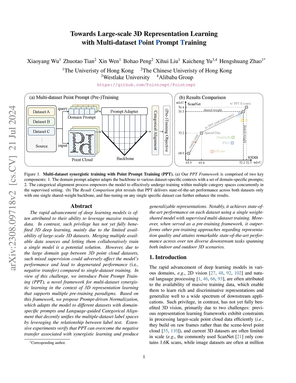 The rapid advancement of deep learning models often attributes to their ability to leverage massive training data. In contrast, such privilege has not yet fully benefited 3D deep learning, mainly due to the limited availability of large-scale 3D datasets. Merging multiple available data sources and letting them collaboratively train a single model is a potential solution. However, due to the large domain gap between 3D point cloud datasets, such mixed supervision could adversely affect the model's performance and lead to degenerated performance (i.e., negative transfer) compared to single-dataset training. In view of this challenge, we introduce Point Prompt Training (PPT), a novel framework for multi-dataset synergistic learning in the context of 3D representation learning that supports multiple pre-training paradigms. Based on this framework, we propose Prompt-driven Normalization, which adapts the model to different datasets with domain-specific prompts and Language-guided Categorical Alignment that decently unifies the multiple-dataset label spaces by leveraging the relationship between label text. Extensive experiments verify that PPT can overcome the negative transfer associated with synergistic learning and produce generalizable representations. Notably, it achieves state-of-the-art performance on each dataset using a single weight-shared model with supervised multi-dataset training. Moreover, when served as a pre-training framework, it outperforms other pre-training approaches regarding representation quality and attains remarkable state-of-the-art performance across over ten diverse downstream tasks spanning both indoor and outdoor 3D scenarios.